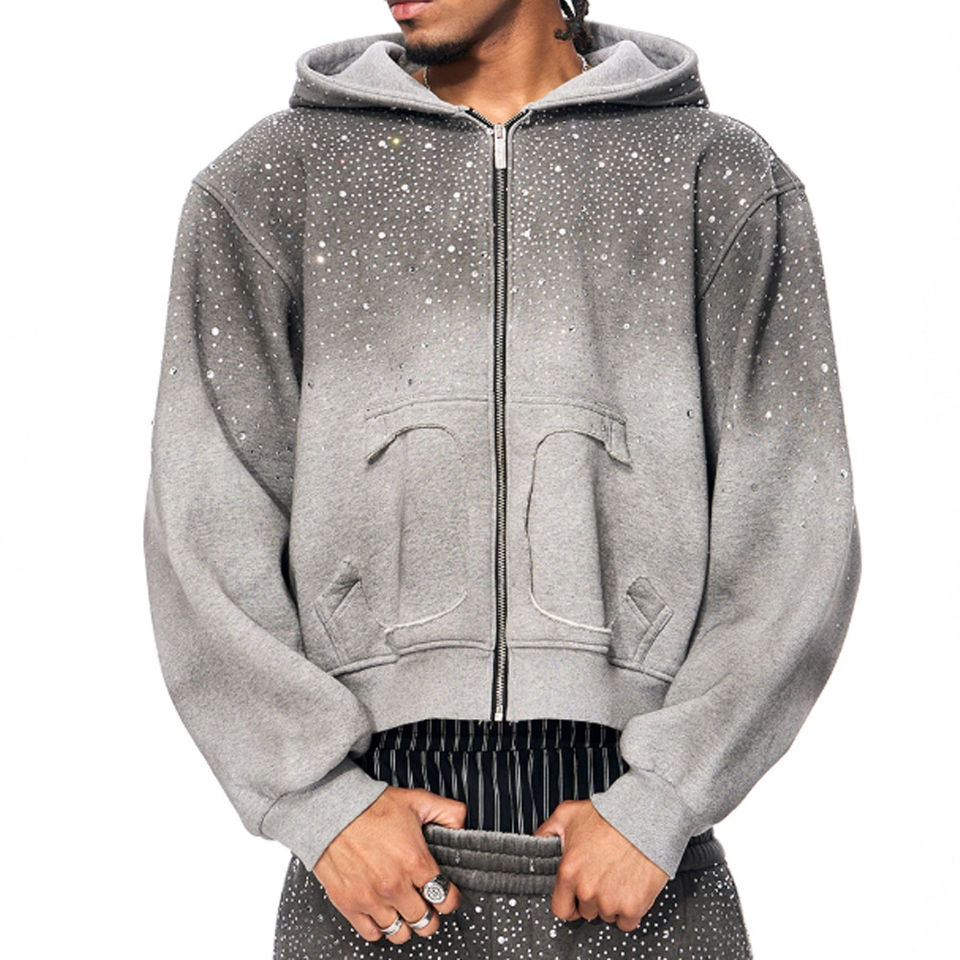 Sudadera con capucha y cremallera Glory para hombre, de algodón 100%, estilo urbano, con efecto desgastado y rotos, color rosa, con pedrería