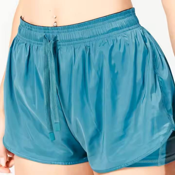 Tela brillante 95% poliéster 5% Elastano Regular Hydro Glaze 2 en 1 pantalones cortos de mujer cintura enrollada con pinza de silicona transpirable