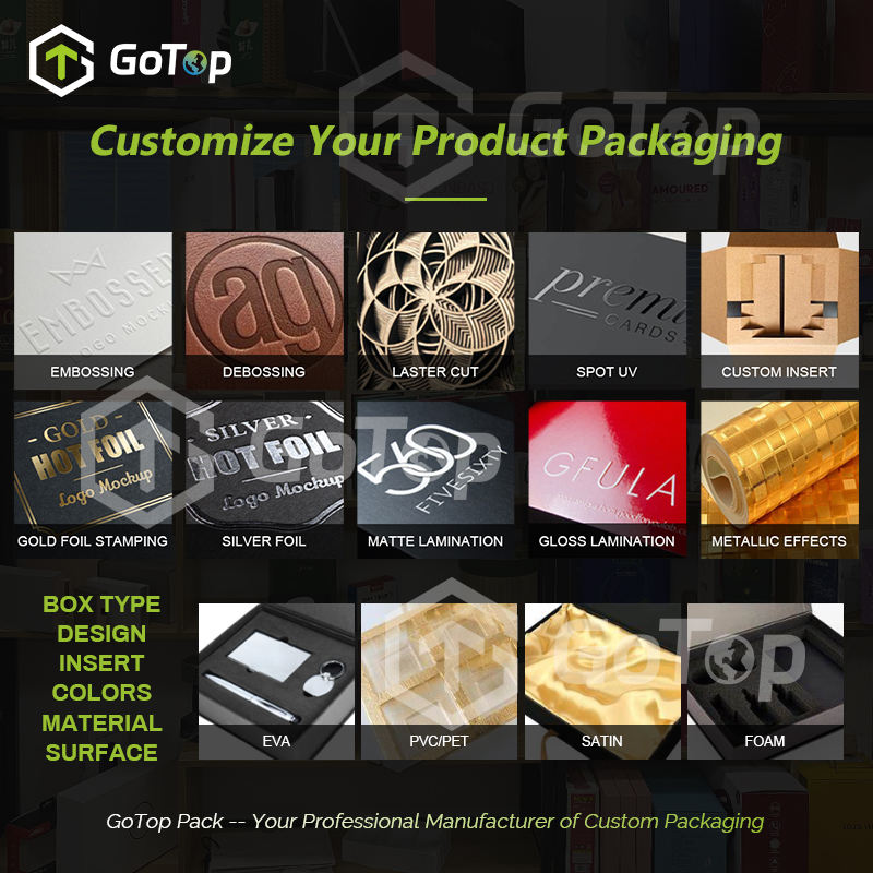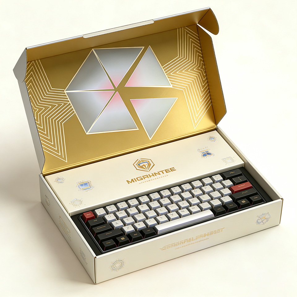 Caja Personalizada GoTop para Teclado Mecánico con Estampado en Lámina Dorada, UV Selectivo, Laminado Mate y Forro de EVA de Precisión