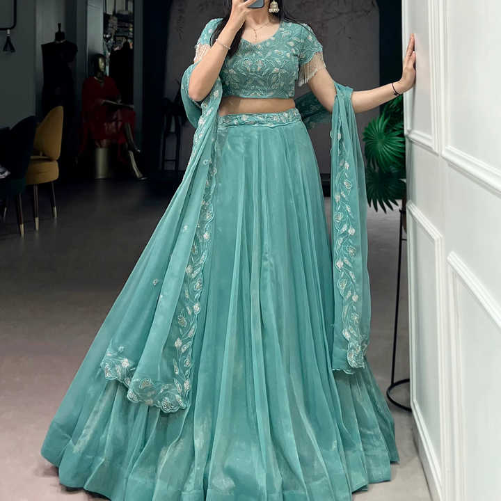 Lehenga Choli con Cuentas Doradas y Bordado con Hilo a Precio de Mayoreo