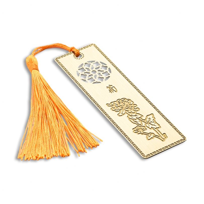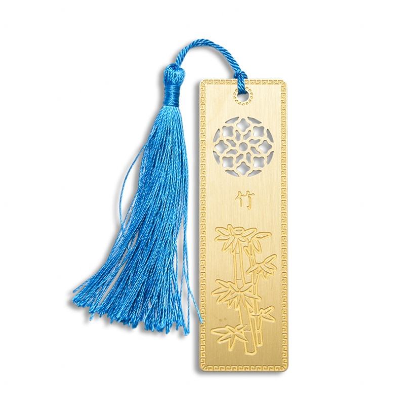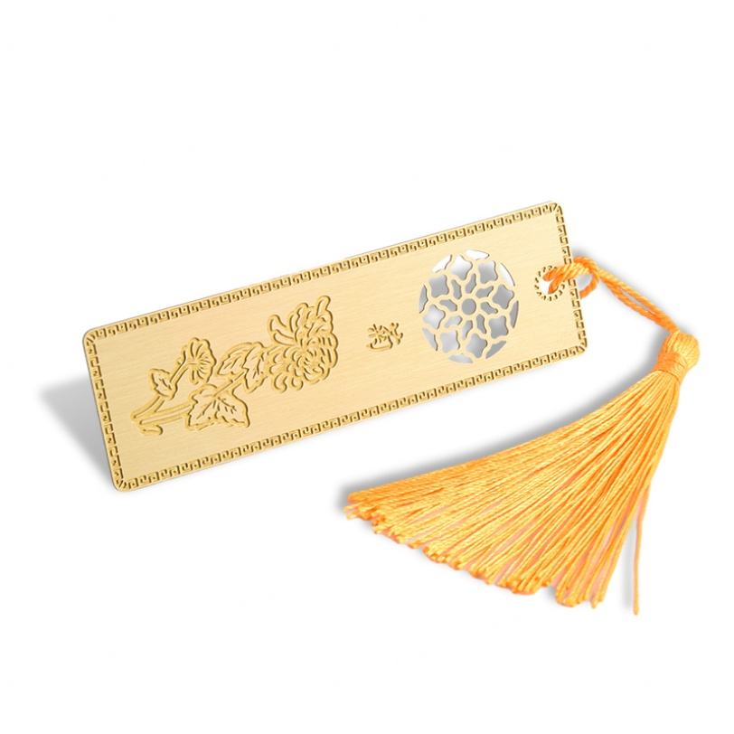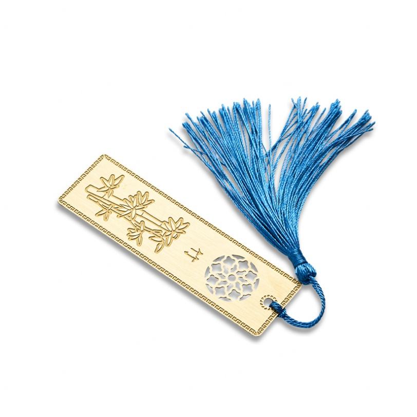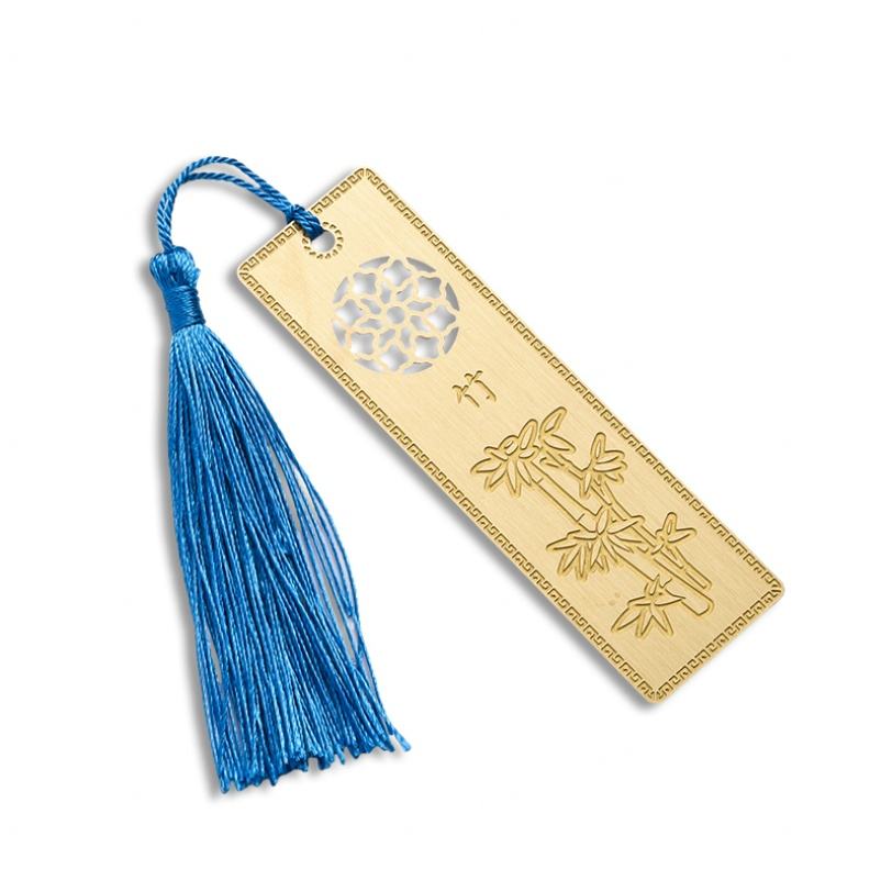 Marcapáginas de Metal Rectangular con Logotipo Personalizado en Color Dorado, Diseño Hueco y Borla