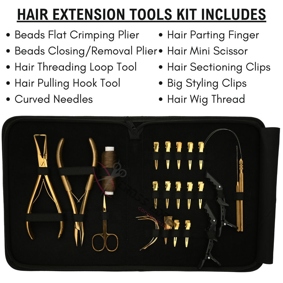 Set de Instalación de Extensiones de Cabello Doradas con 7 Pinzas, Herramienta para Remover Cuentas Planas, Hilo para Pelucas, Clips Profesionales de Estilismo