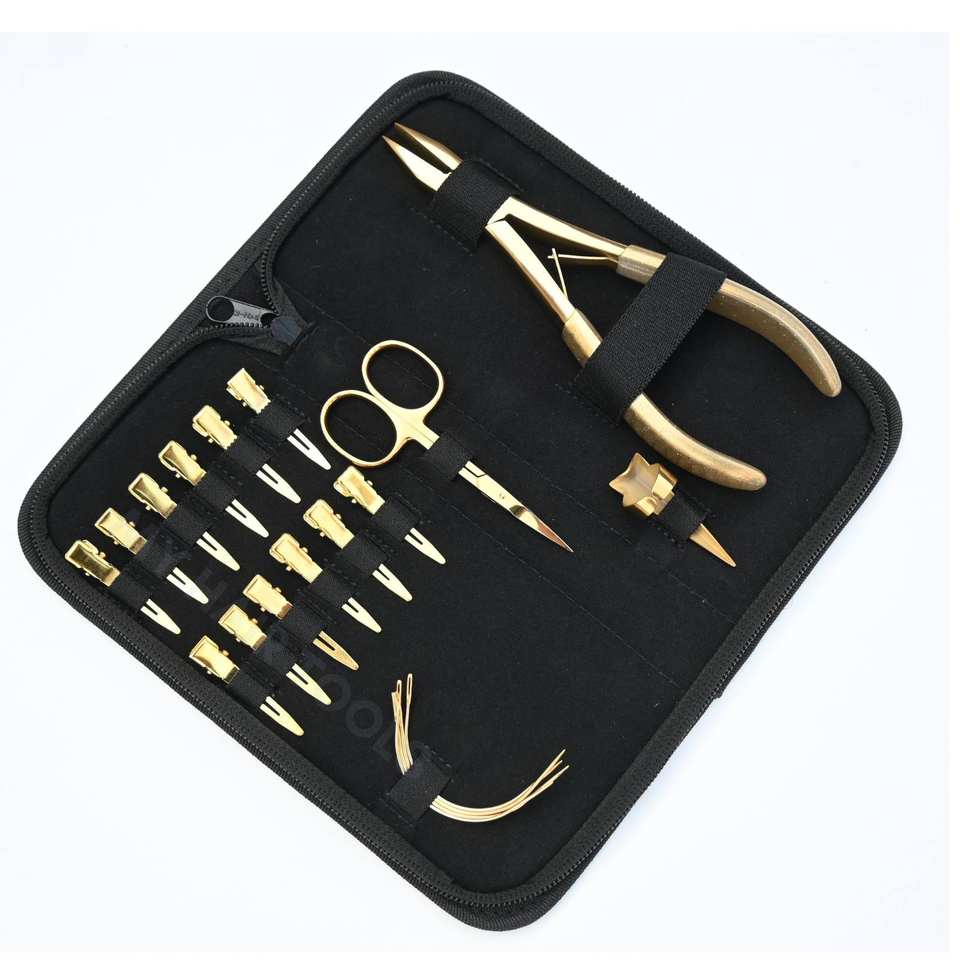 Kit de herramientas para extensiones de cabello doradas con alicates de engarzado de alta resistencia y punta plana