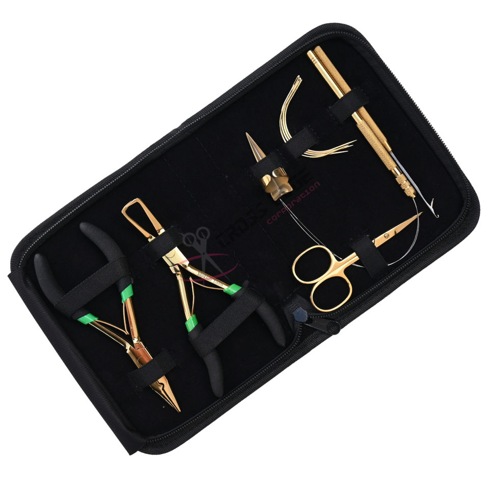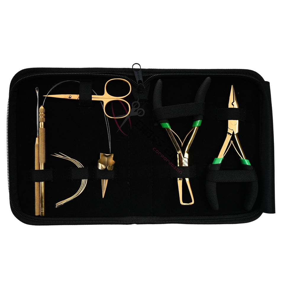 Kit de herramientas para extensiones de cabello con tenacilla de cuentas doradas y tijeras de precisión para hilo.