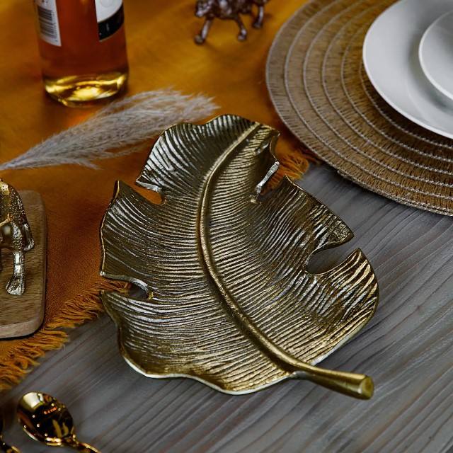 Plato decorativo de hoja de palma dorada, plato de hoja de aluminio fundido, plato para servir, decoración Tropical, centro de mesa, plato de hoja dorada