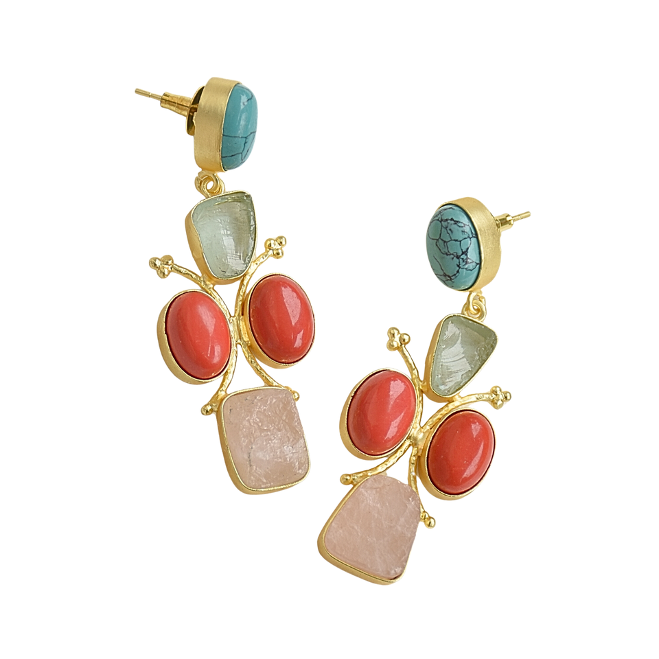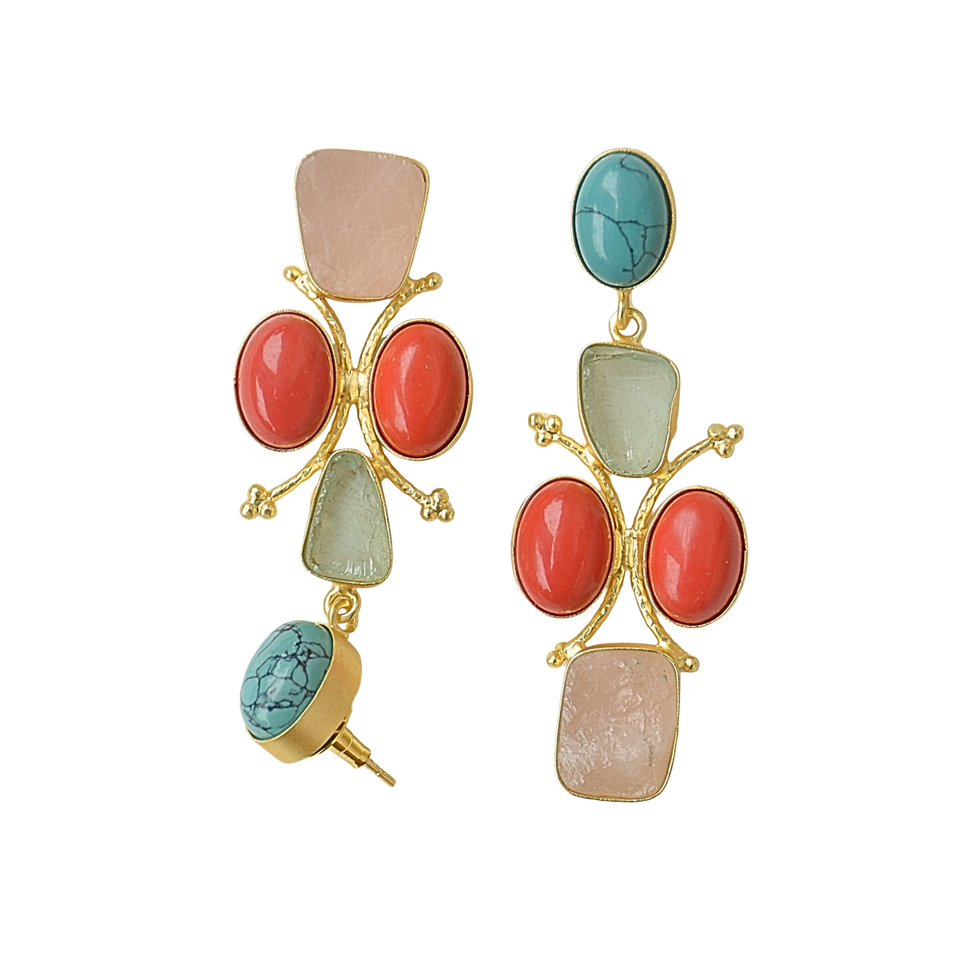 Pendientes Colgantes Geométricos Hechos a Mano con Turquesa y Múltiples Piedras, Chapados en Oro, Joyería Contemporánea de Piedras Semipreciosas para Mujer