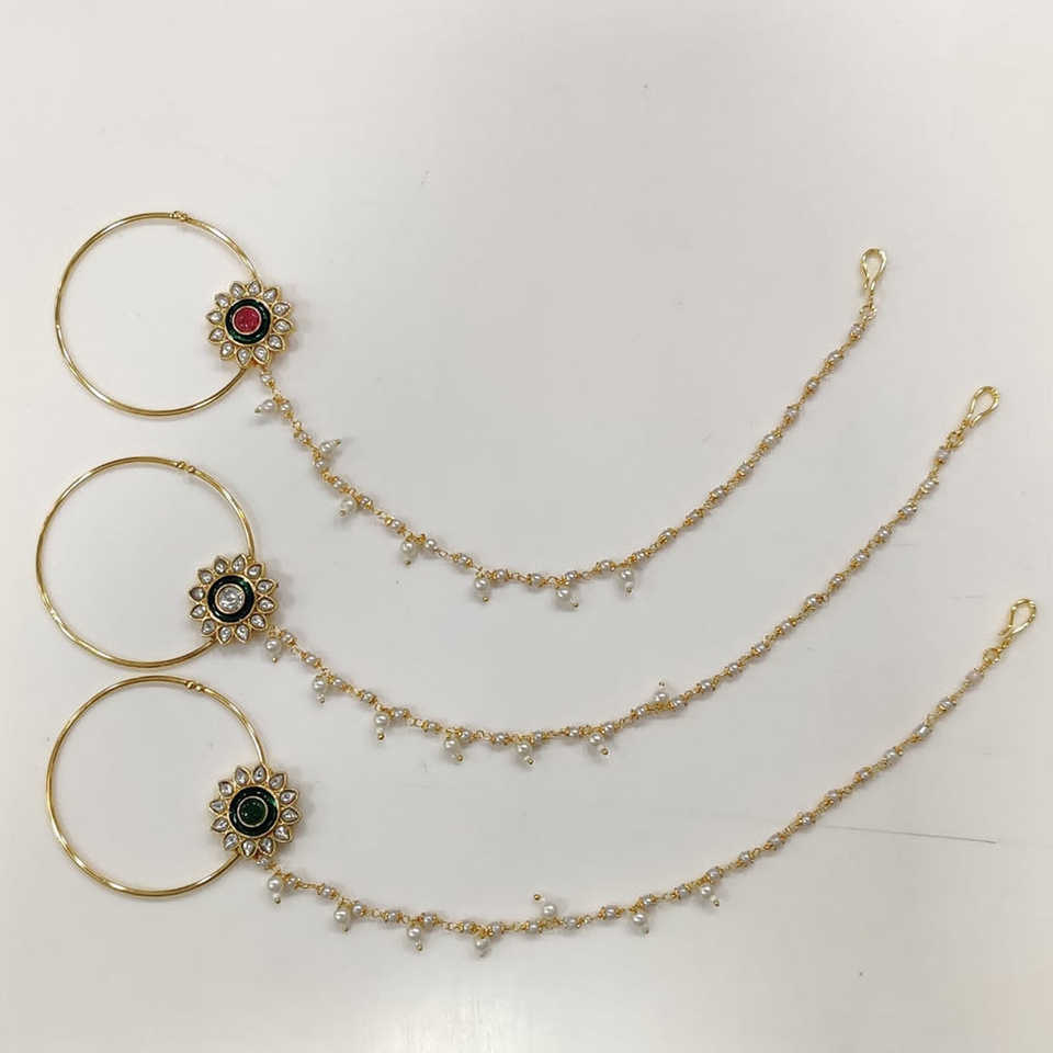 Anillo de nariz fino con perlas y piedra Kundan chapado en oro