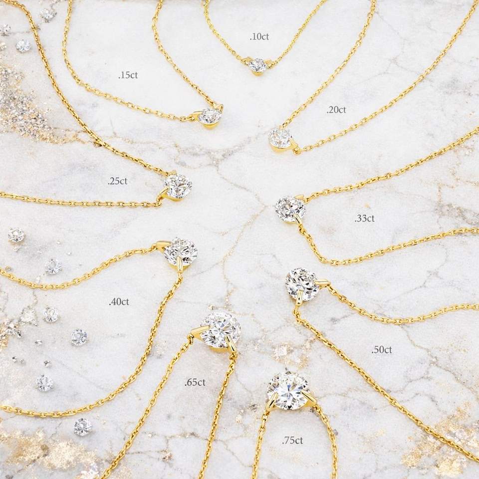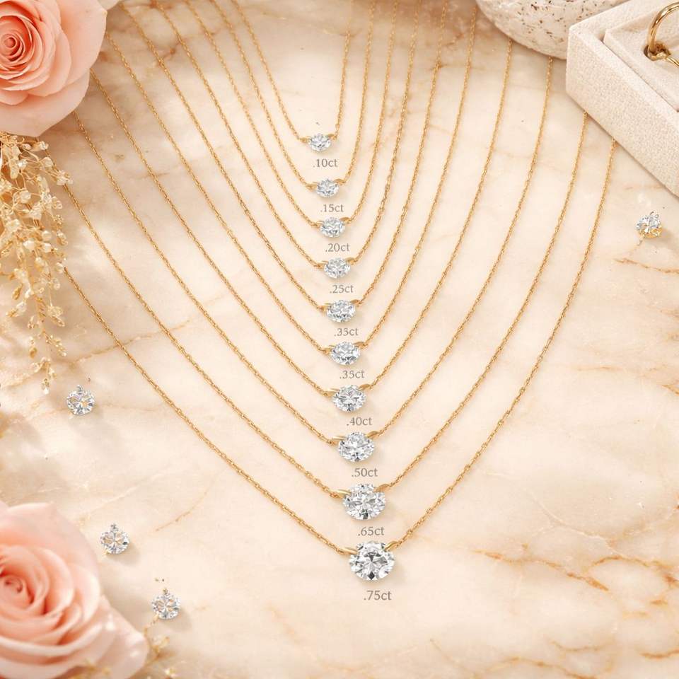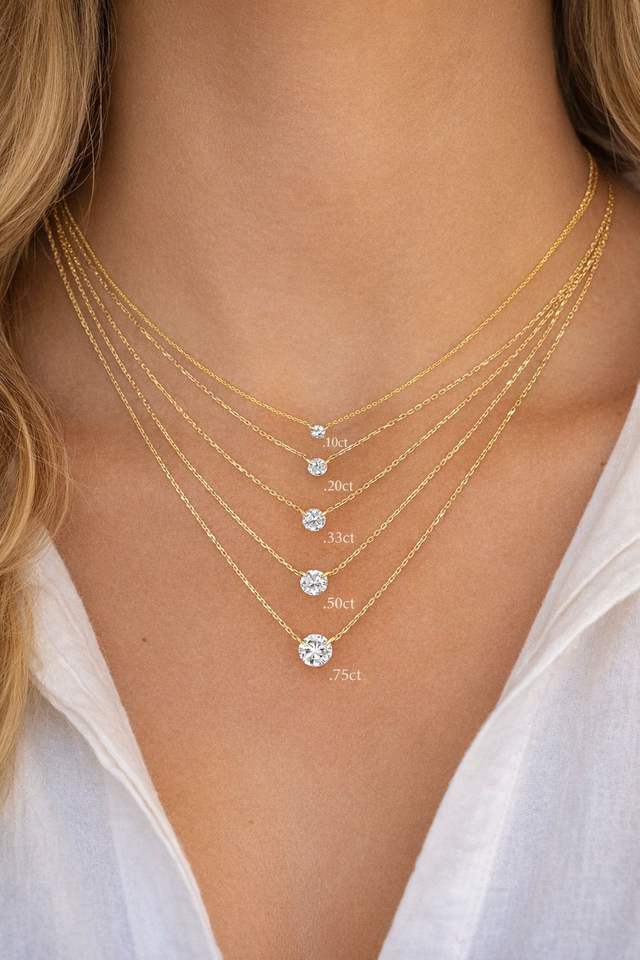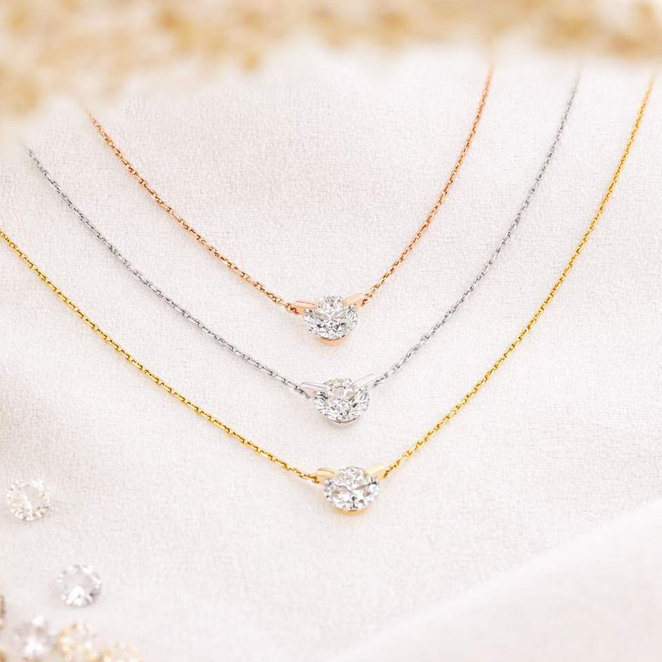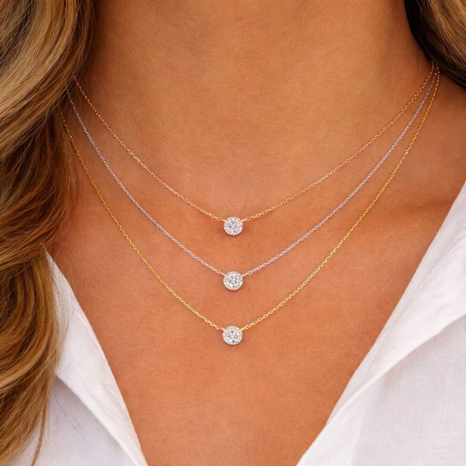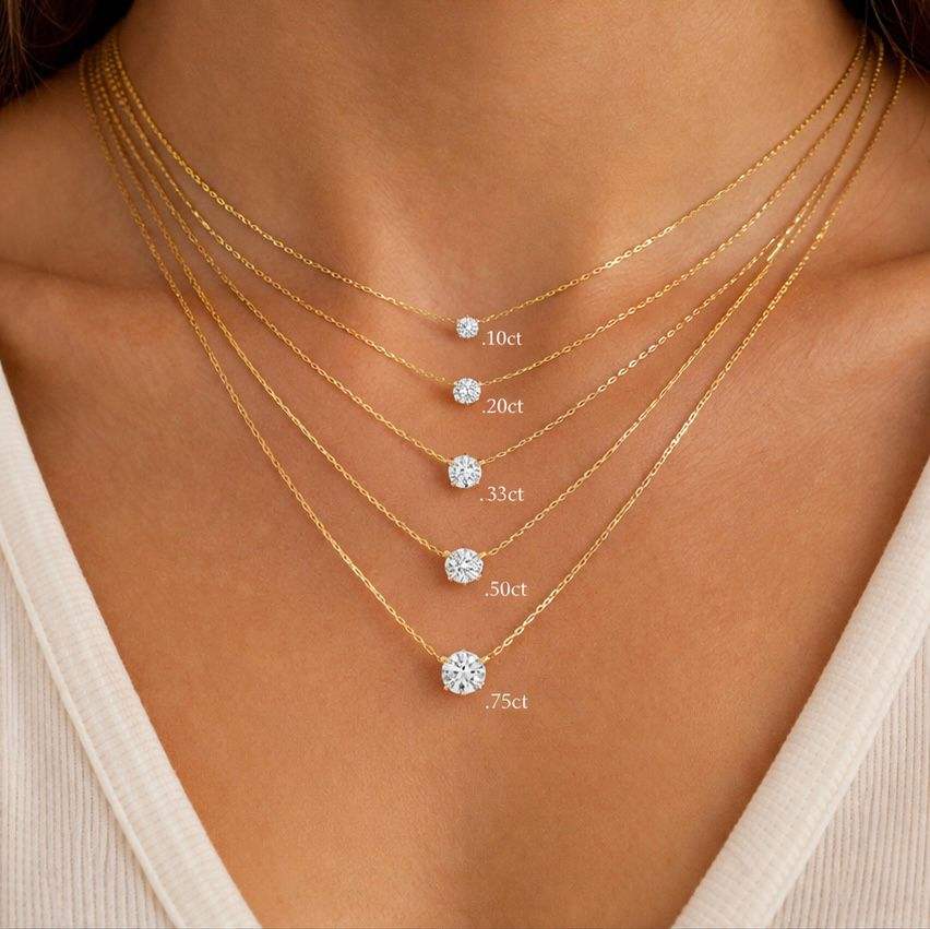 Collar Solitario de Diamante de Corte Brillante Flotante Chapado en Oro sobre Plata, Perforado con Láser, Certificado IGI, Cultivado en Laboratorio, Cadena Ajustable