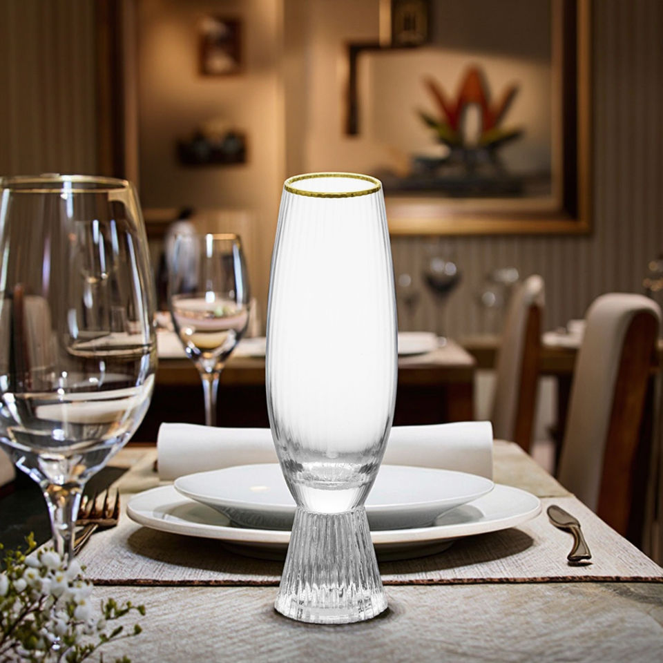 Copa de Flauta con Borde Dorado y Diseño Acanalado, Hecha a Mano, de Vidrio Transparente de 210 ml, Elegante para Vino Espumoso y Prosecco, para Bodas, Fiestas y Regalos