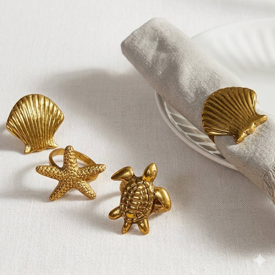 Anillos para Servilletas con Diseño de Conchas Doradas, Serie Vida Costera Oceánica, Porta Servilletas Metálicos para Banquetes de Boda, Fiestas y Decoración de Mesas de Hotel