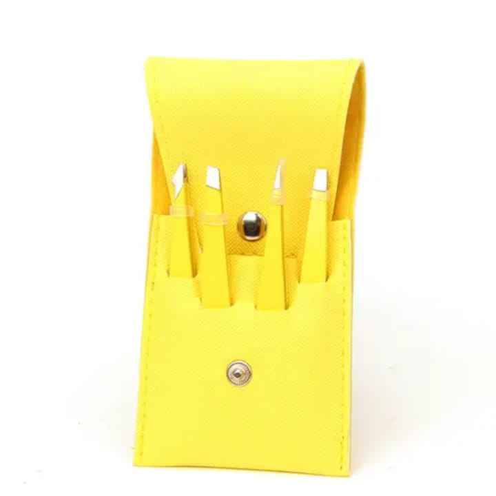 Juego de 4 Piezas de Pinzas y Tijeras para Cejas de Acero Inoxidable con Punta Inclinada Dorada, Estuche de Cuero Sintético de Lujo Ecológico