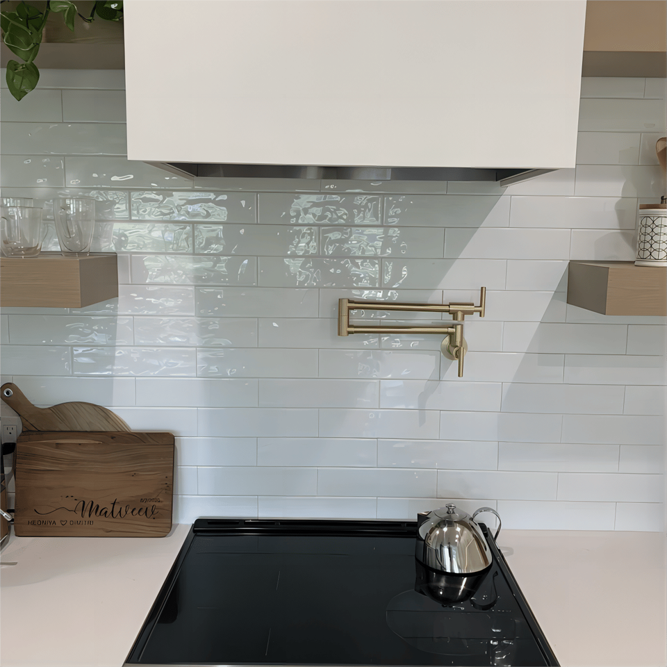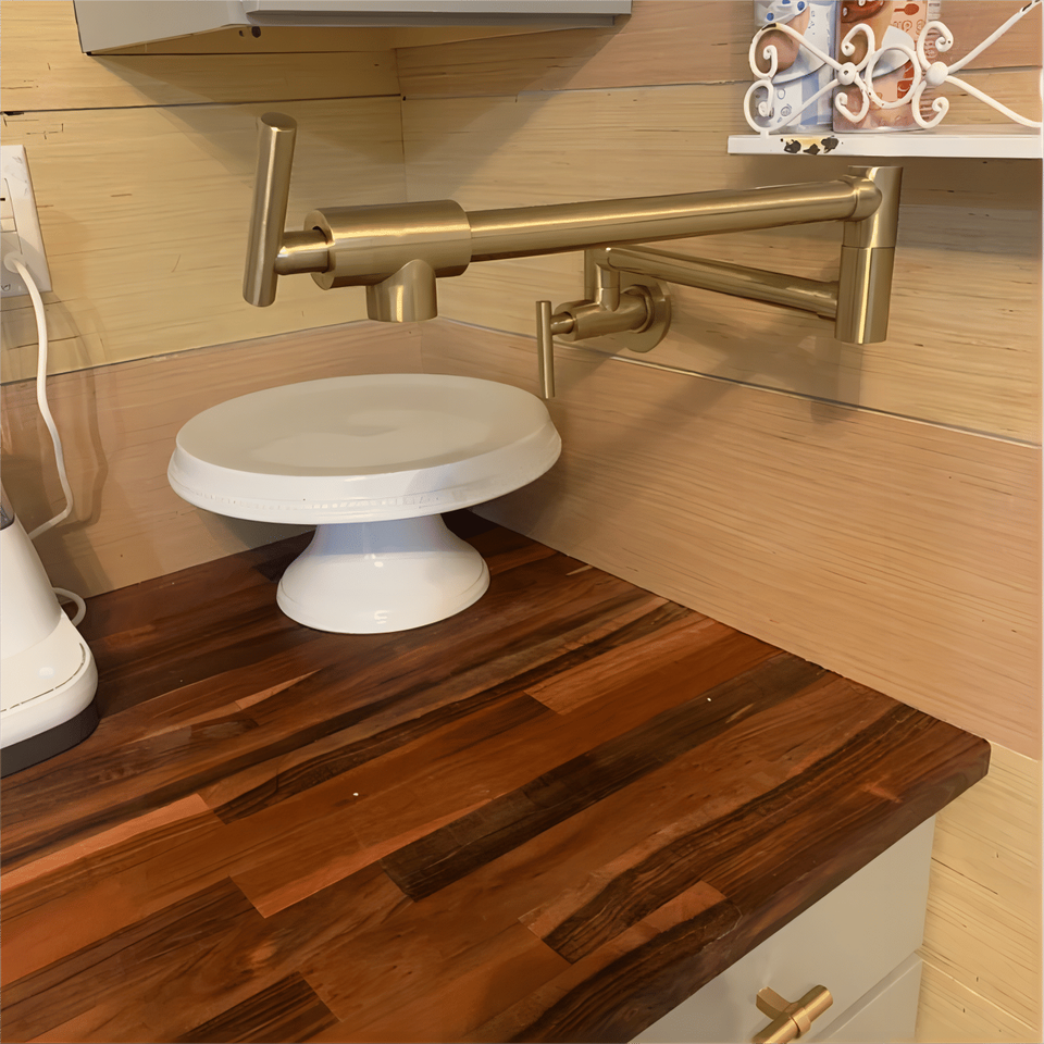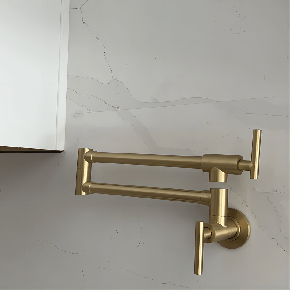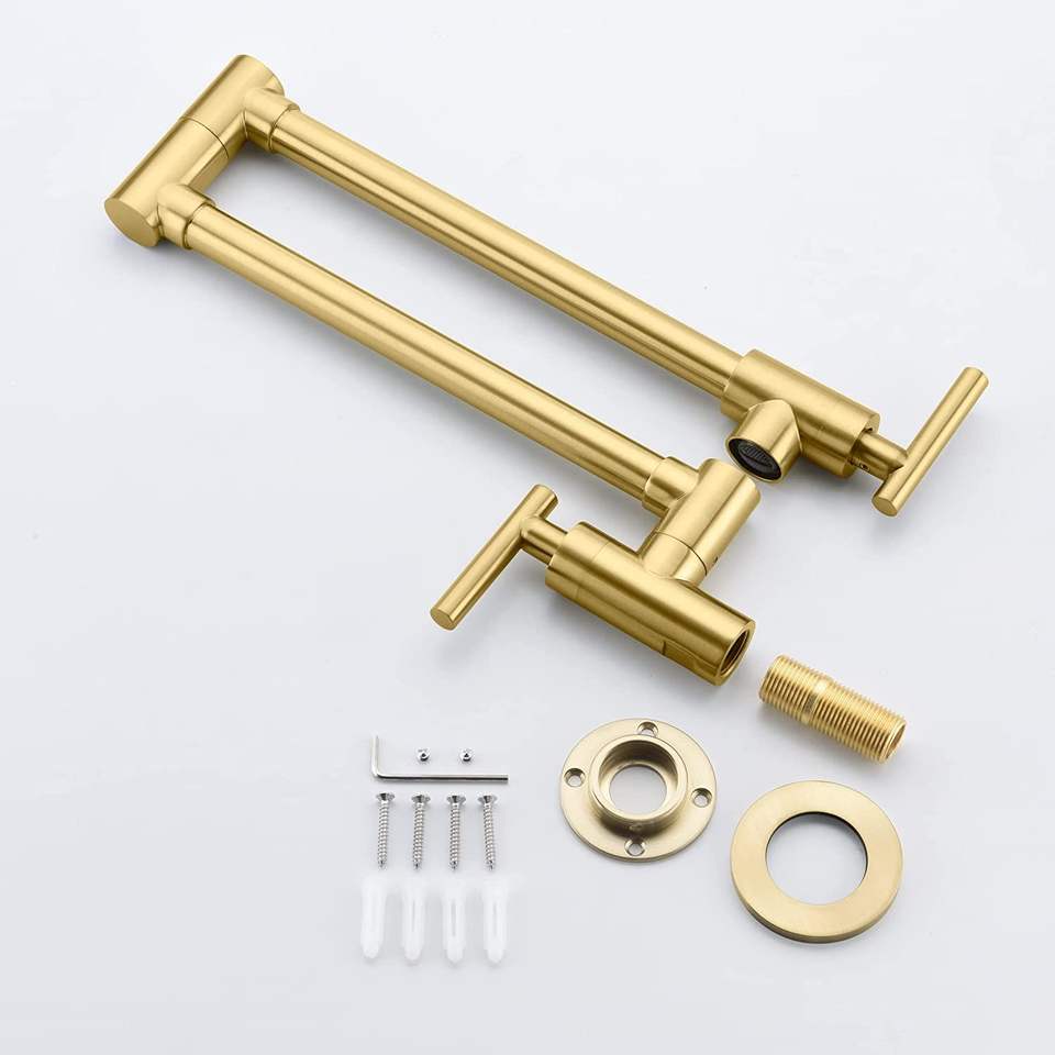 Grifo de cocina dorado de dos manijas con brazos oscilantes de doble articulación, diseño plegable de montaje en pared para llenado de ollas