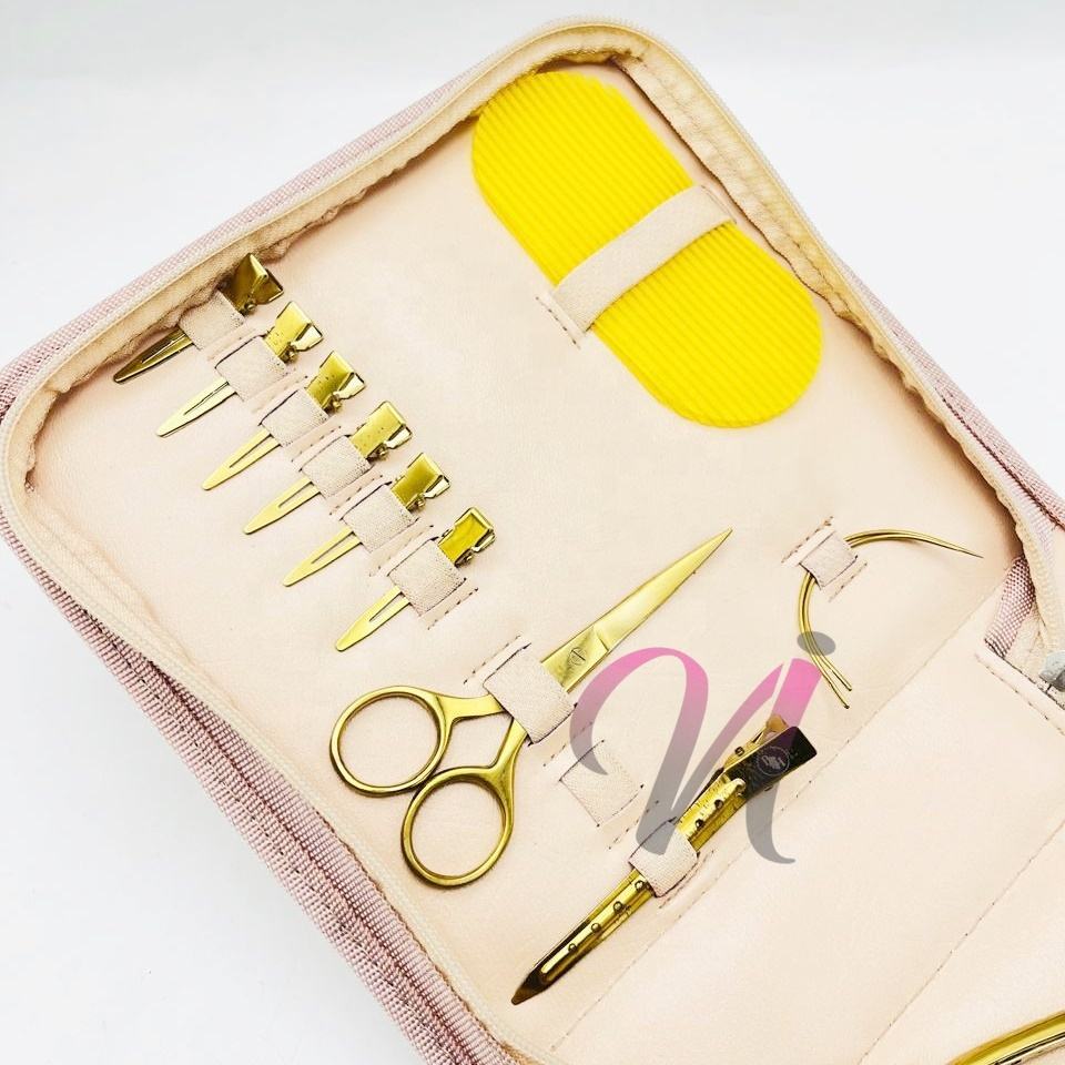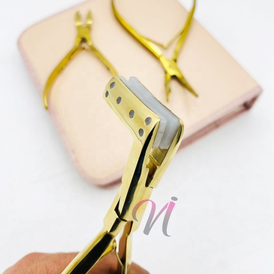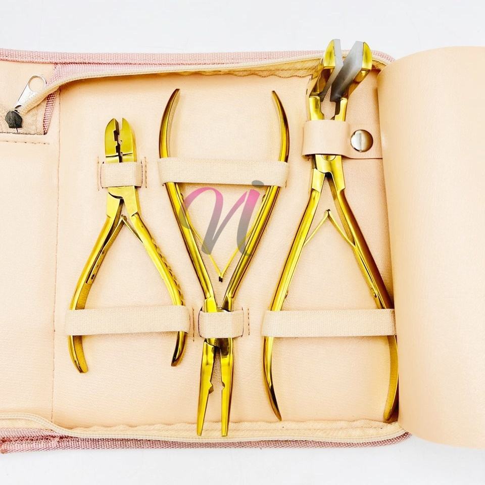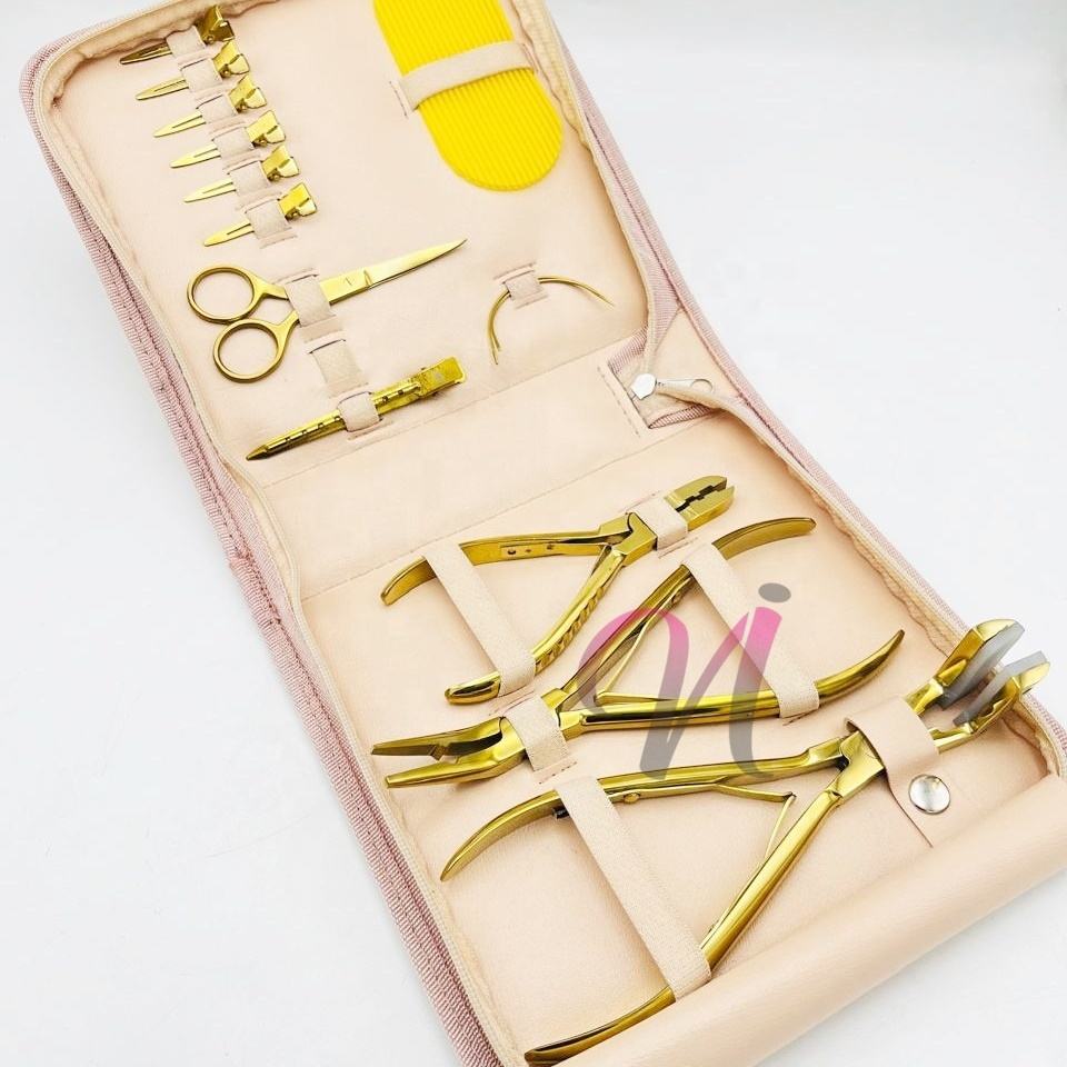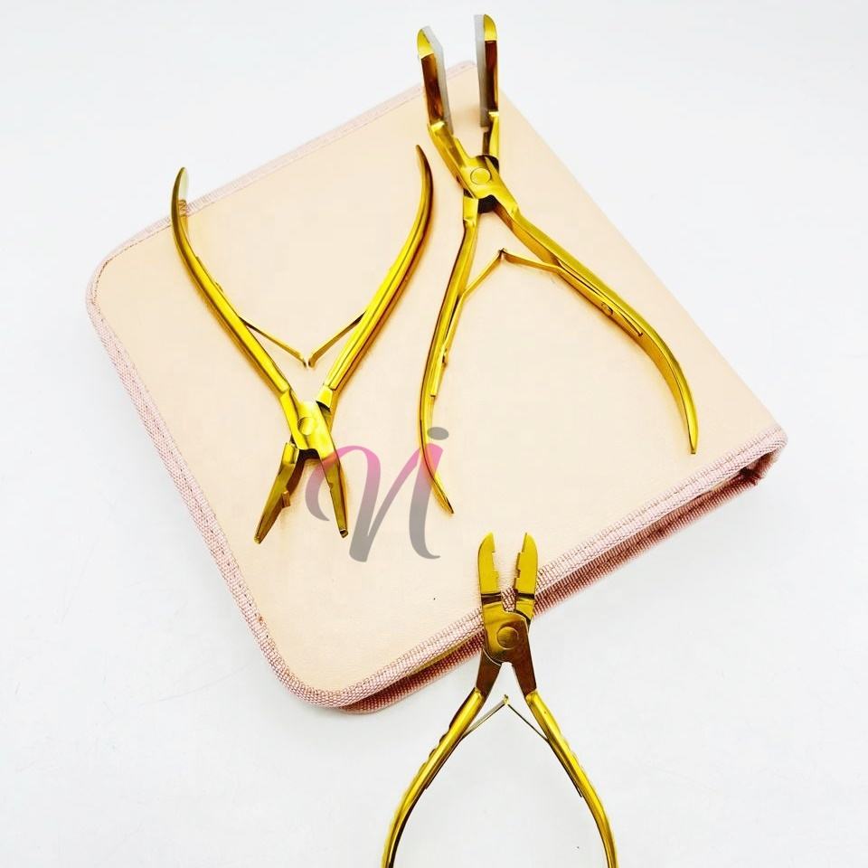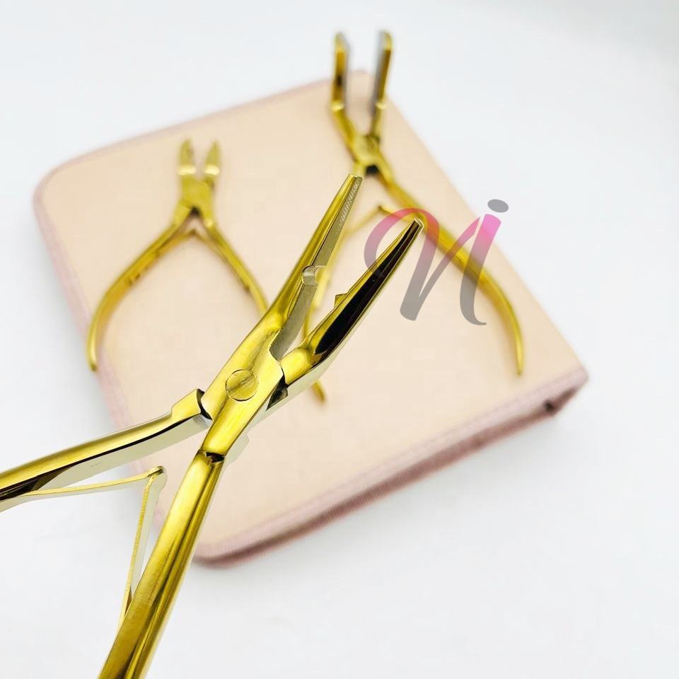 Kit de herramientas de extensión de cabello sostenible chapado en oro que incluye agujas tipo C, pinzas de seccionamiento, alicates y pinzas de metal de cocodrilo