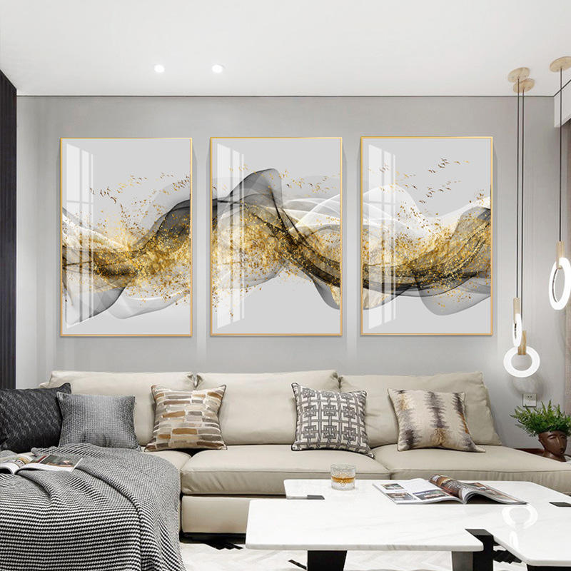 Arte de Pared Abstracto Dorado con Cinta, Paisaje, Naturaleza Muerta, Decoración del Hogar, Póster de Pájaros Volando, Pintura Minimalista de Porcelana de Cristal
