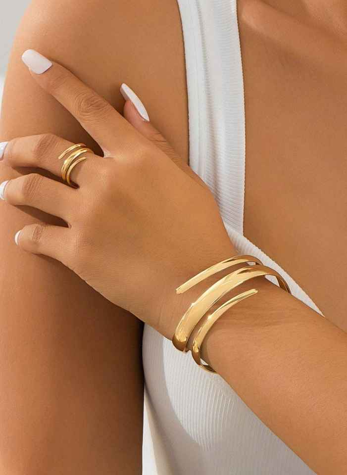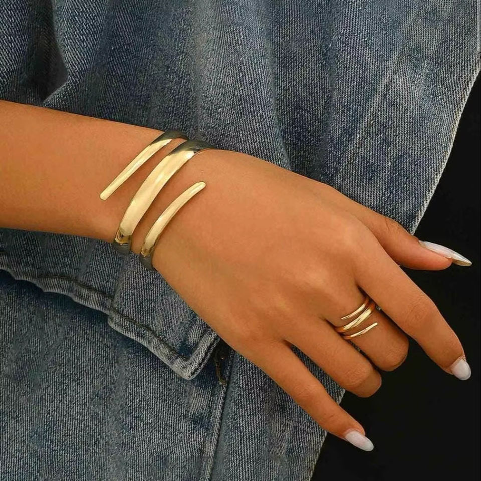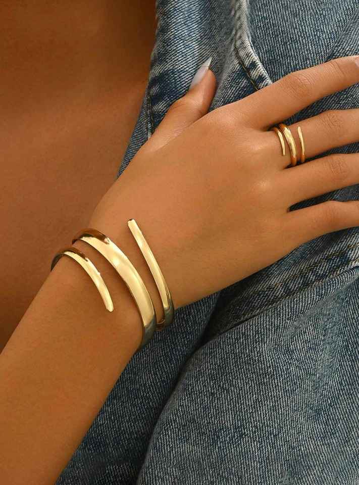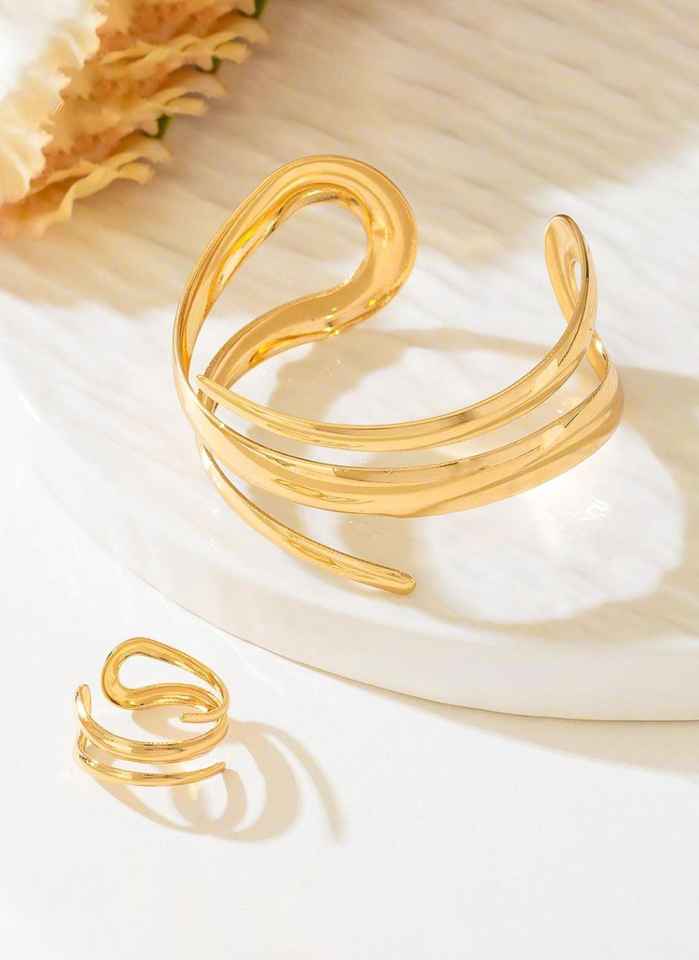 Juego de anillos de pulsera de remolino dorado, brazalete moderno chapado en oro trenzado y juego de anillos en espiral, joyería metálica pulida
