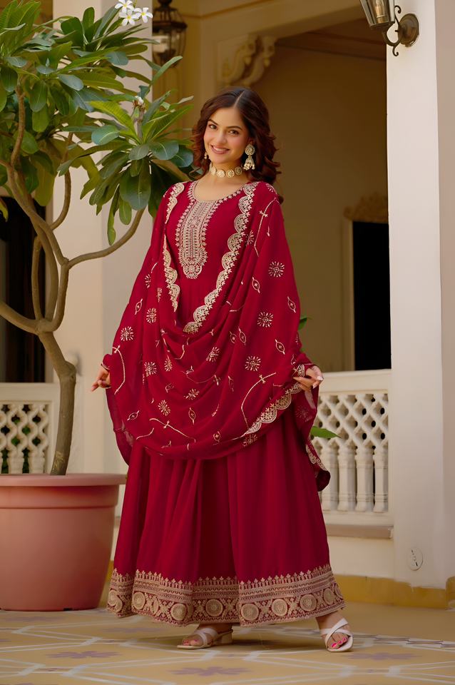 Vestido con bordado de hilo dorado y delicado bordado artesanal. Incluye una dupatta a juego para completar su look festivo y majestuoso.