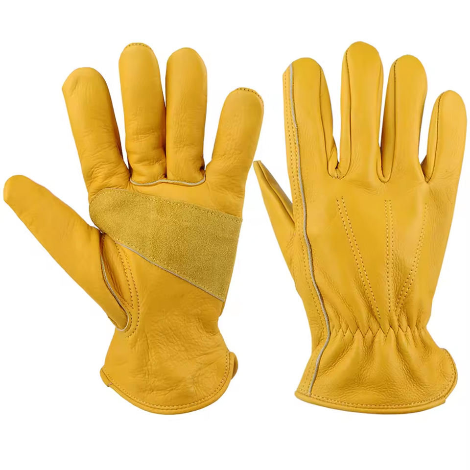 Guantes de aparejo de cuero de grano de vaca amarillo dorado con pulgar trapezoidal Guantes de conductor de trabajo de cuero de alta calidad para uso industrial