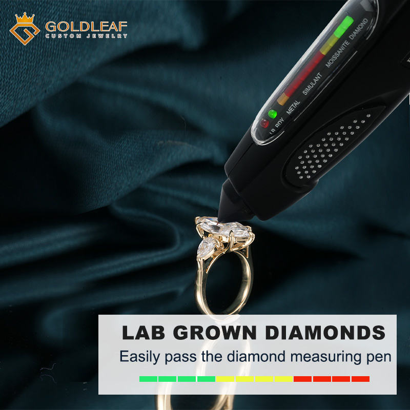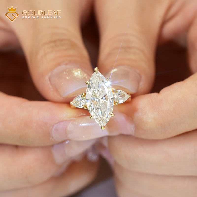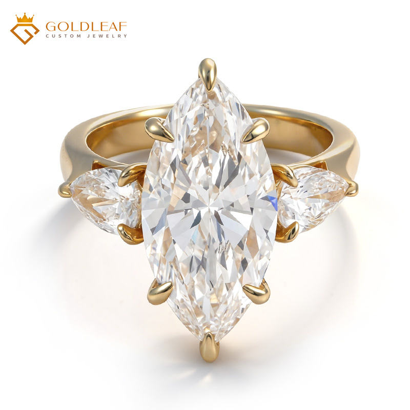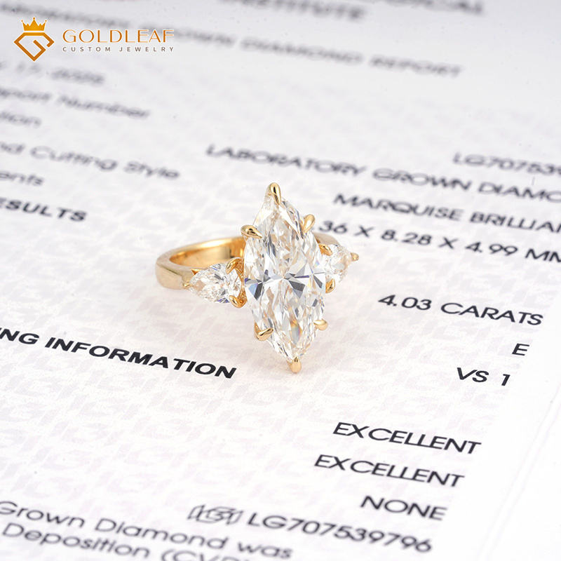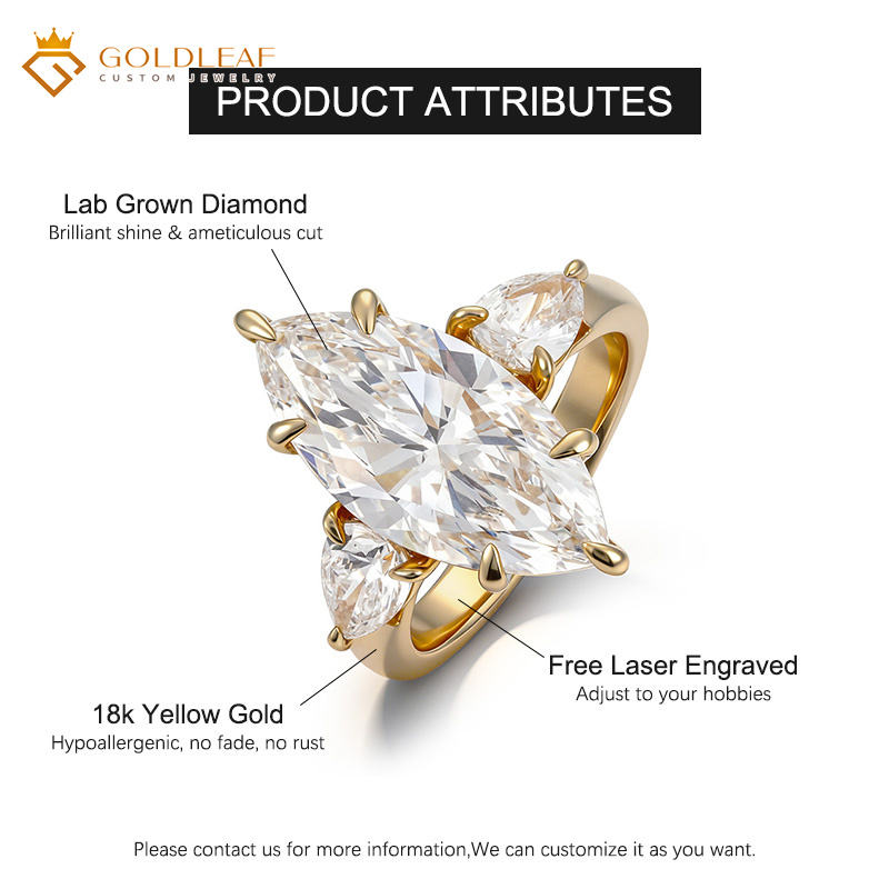 Anillo de compromiso y boda de lujo de oro de 18 quilates con diamante cultivado en laboratorio Goldleaf, corte marquesa, color E, personalizado, para aniversario y uso diario