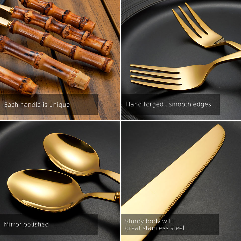 Buen Color Mango de madera natural Cuchara Tenedor Cuchillo Juego de cubiertos Caja de regalo Cubiertos de acero inoxidable 304 con mango de Bambú