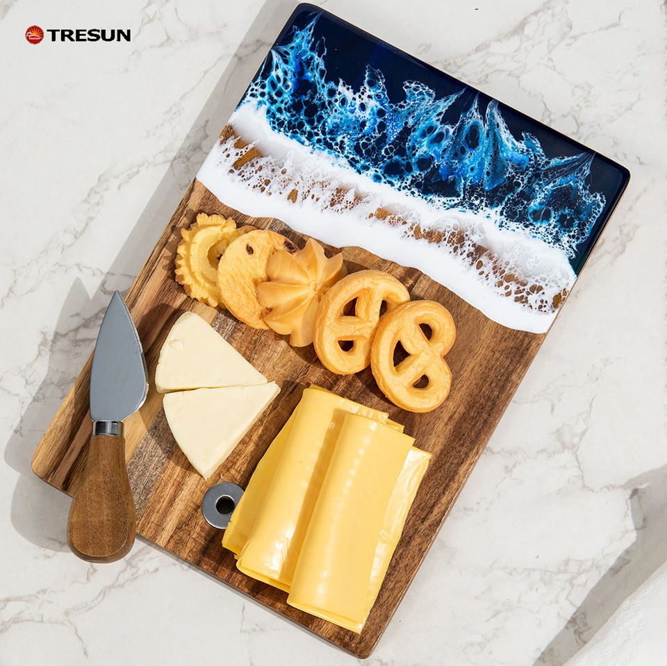 Buen diseño, resina epoxi oceánica y corte de madera de Acacia, tabla para cortar embutidos, tapas, queso
