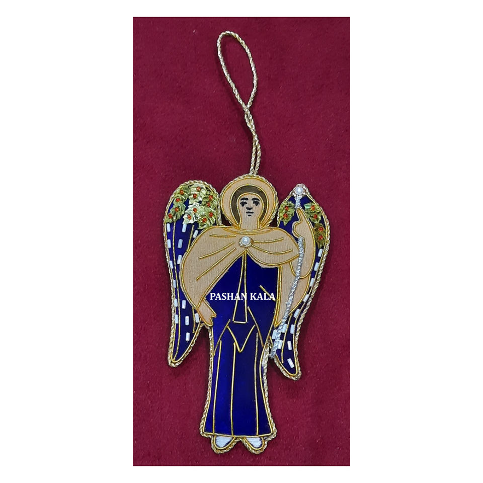 Bonito bordado de Zari dorado con forma de Ángel hecho a mano, Color azul, con cuentas, adorno colgante de Navidad y cantidad a granel