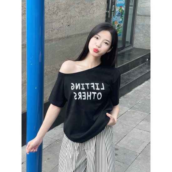 Camiseta de un Solo Hombro para Mujer a Buen Precio, Manga Corta, Estampado de Letras Moderno, Tela de Algodón Suave Tipo Papel, Color Negro