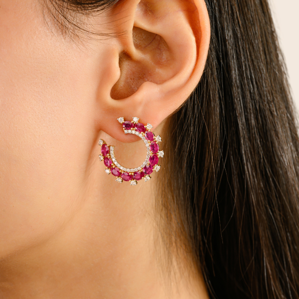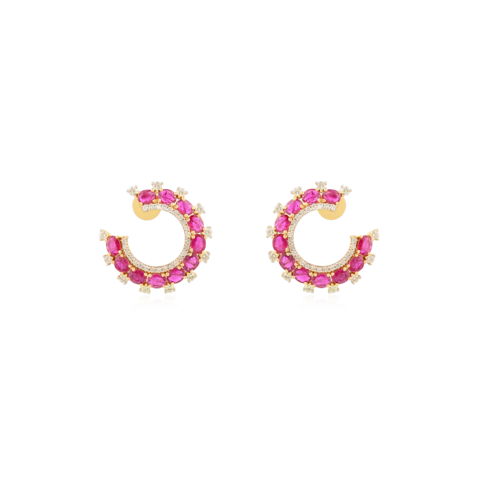 Buena calidad 100% auténtico sólido 14K oro amarillo rubí y Diamante medio círculo pendientes de boda venta al por mayor joyería de mujer