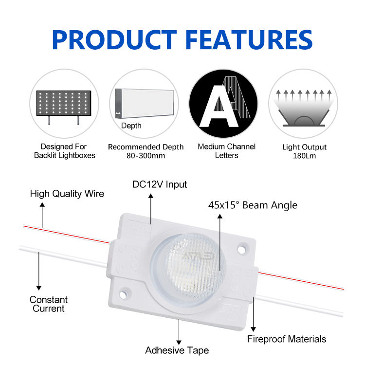 Módulo de Luz Lateral LED de Buena Calidad, Tira de 20 Piezas/Cadena, Módulo LED con Adhesivo Azul 3030SMD, 1 Lente, 12V, IP65, 2W, Módulo LED con Iluminación Lateral