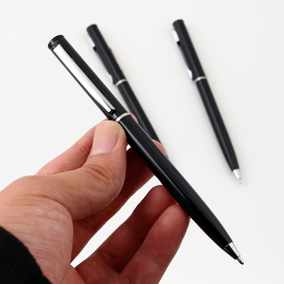 Bolígrafo de metal negro de hotel, de tamaño delgado, de buena calidad, con logotipo impreso, para regalo.