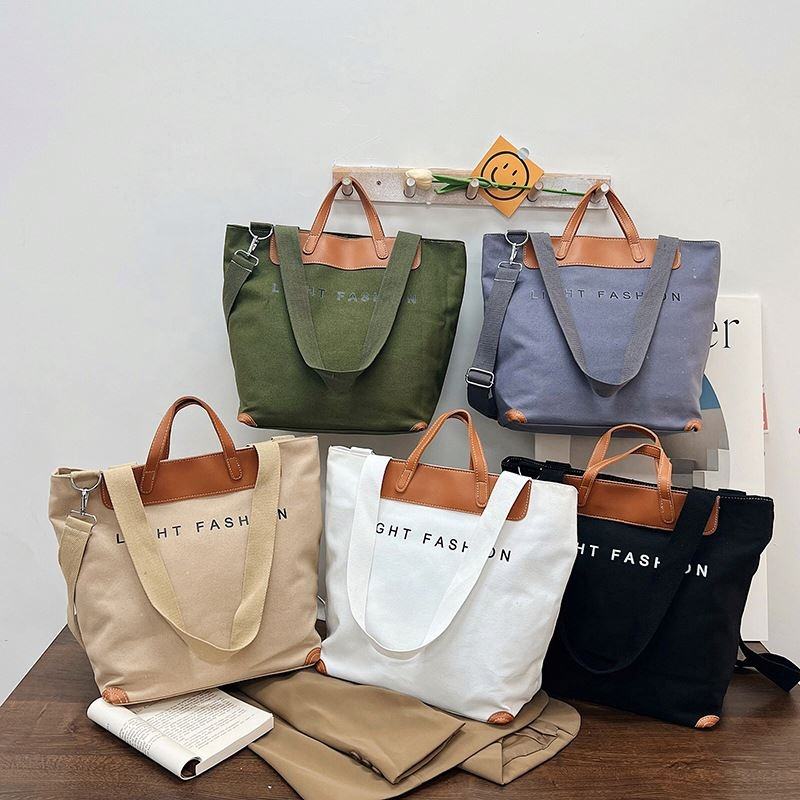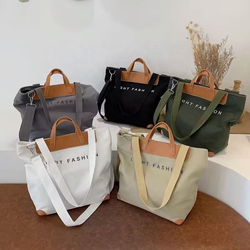 Bolsas de compras de gran tamaño con cremallera de lona de algodón de gran capacidad con asa de cuero PU de diseñador personalizado de buena venta