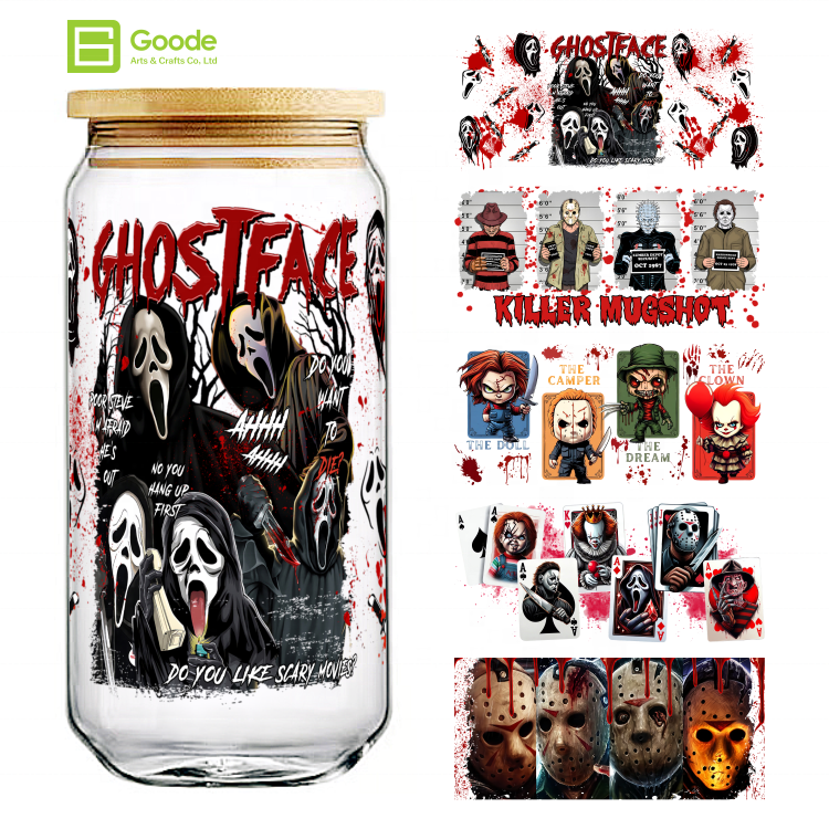 Pegatina de transferencia Goode Tumbler impermeable con diseño de esqueleto, payaso, pánico, gritos y miedo, personalizable, UV DTF, para envolturas de vasos de vidrio de 16 oz