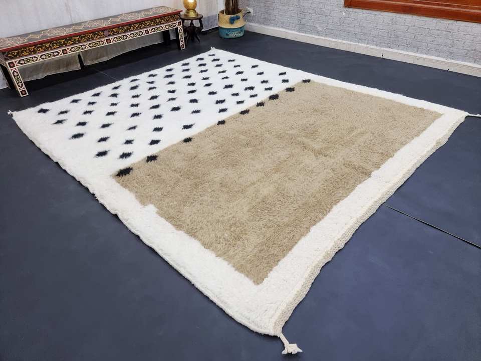Hermosa alfombra marroquí personalizada Beniourain lana hecha a mano de oveja punteada Beige blanco patrón abstracto precio de distribuidor al por mayor