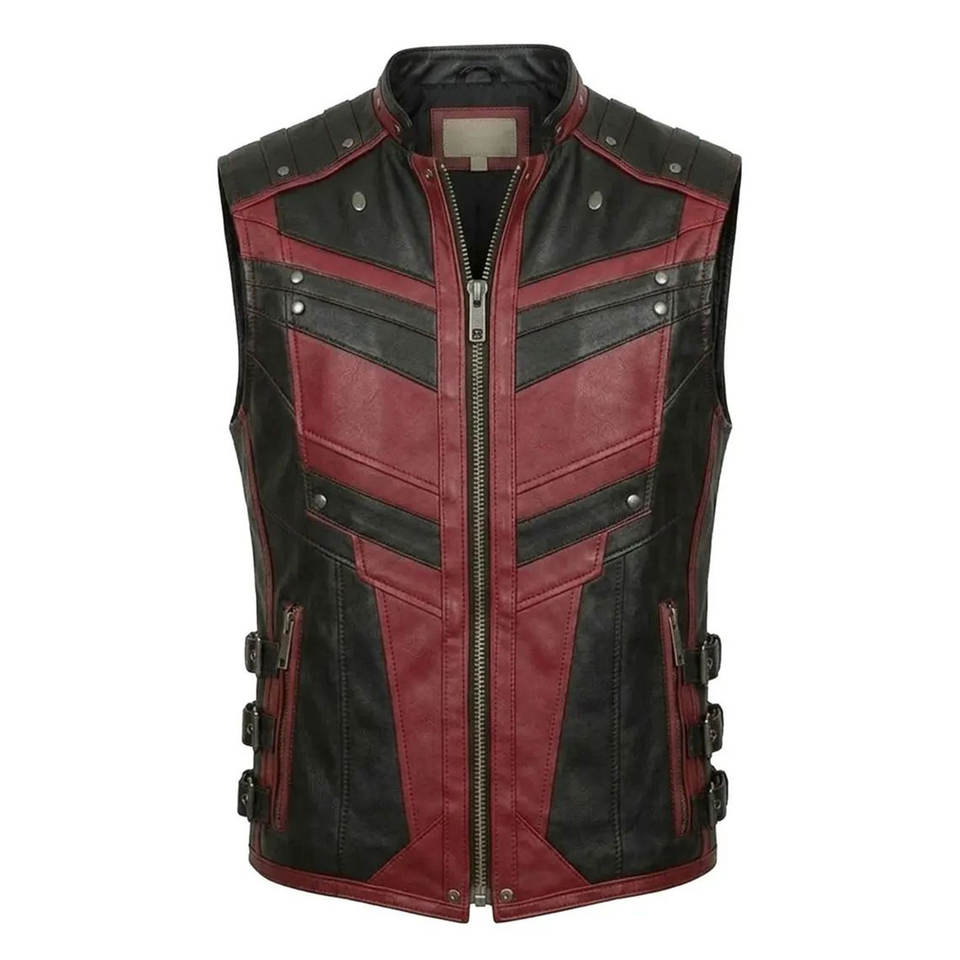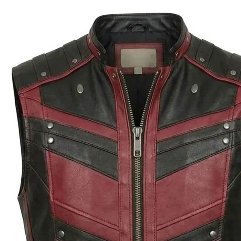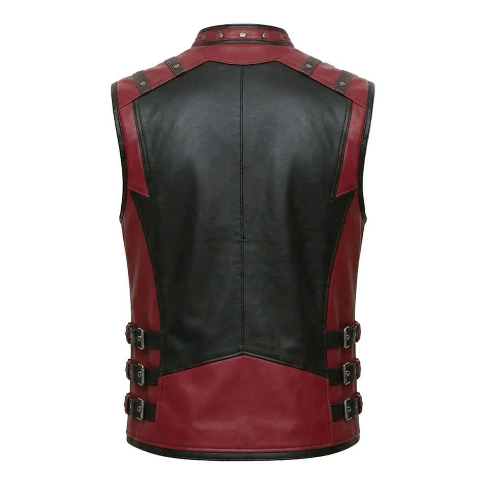 Chaleco Gótico con Aspecto de Cuero Desgastado, Chaleco Estilo Motero Steampunk Rojo y Negro, Chaqueta Punk para Cosplay