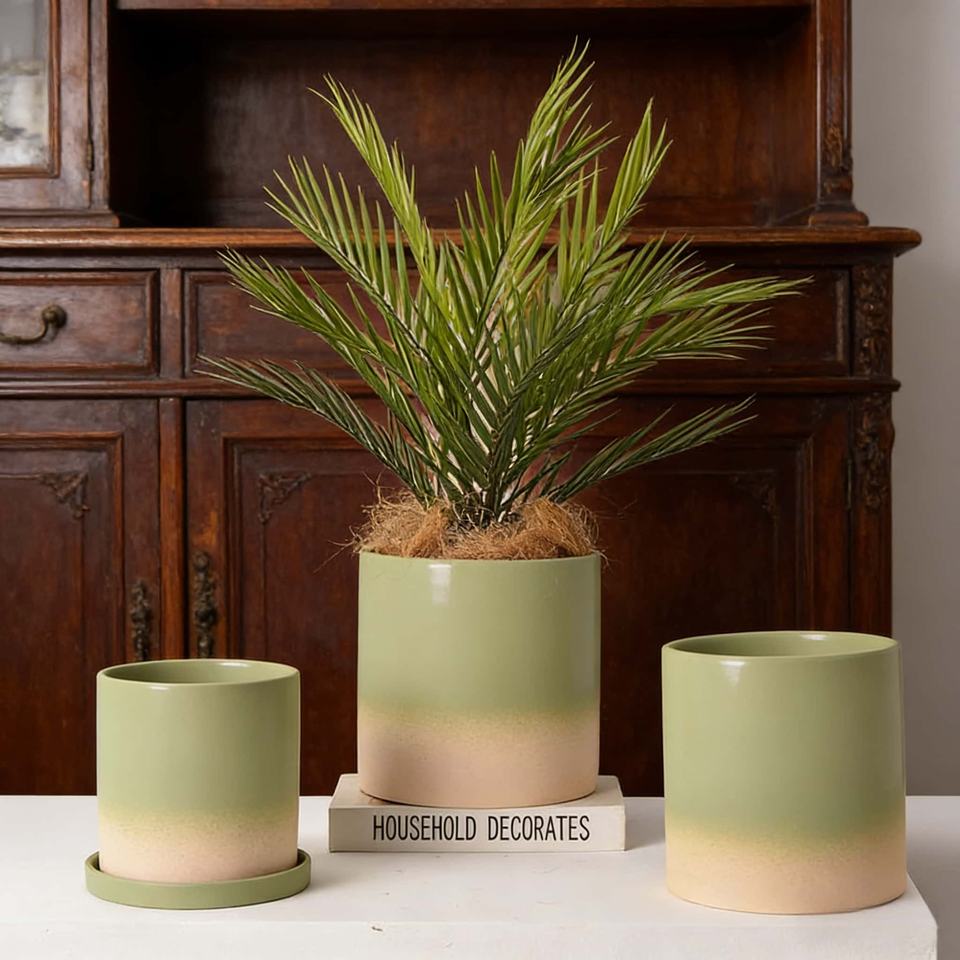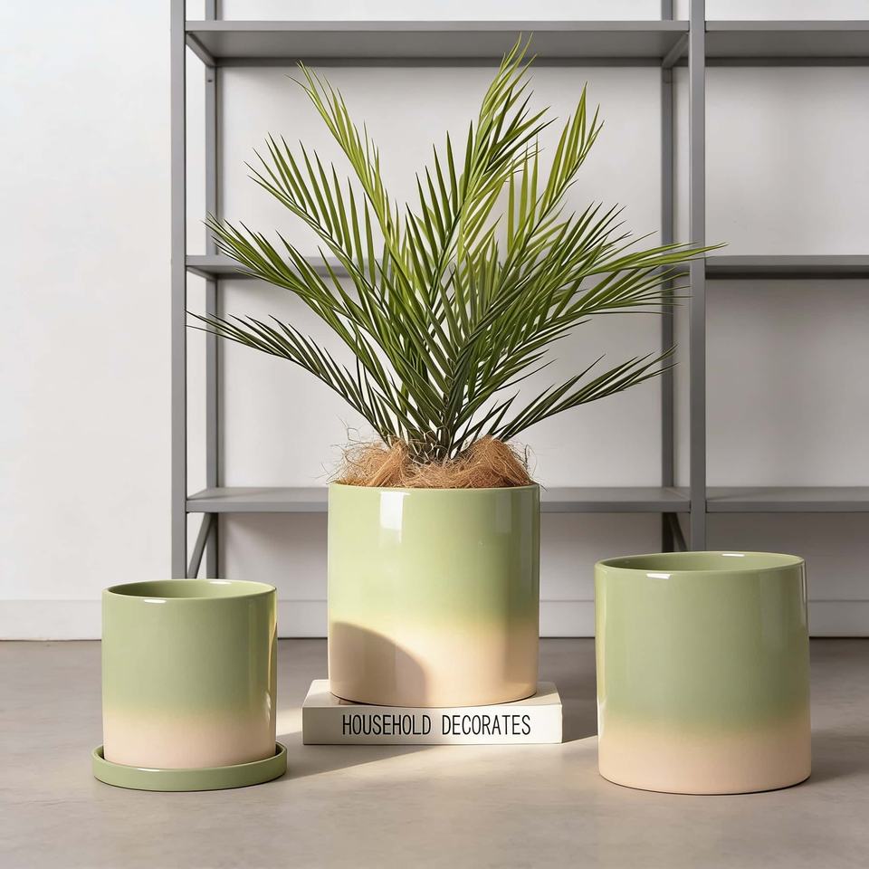 Maceta de Cerámica Verde Oliva Degradado con Orificio de Drenaje y Autorriego, Diseño Moderno Ecológico para Uso en Interiores/Exteriores