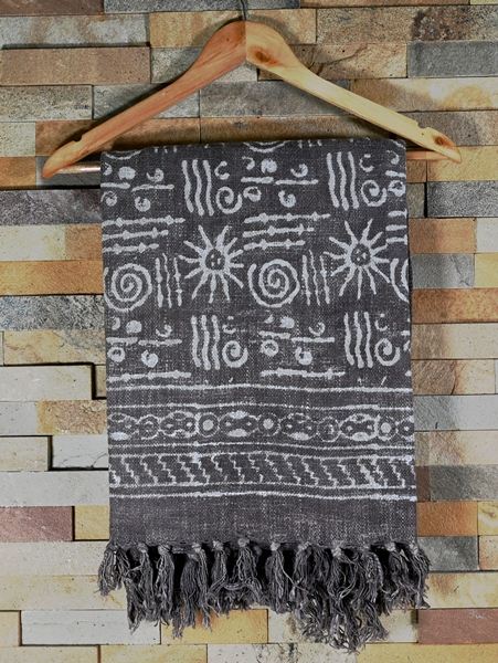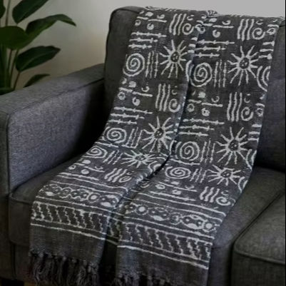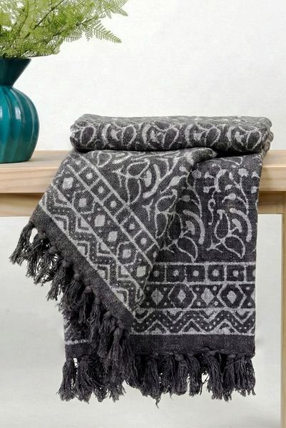 Manta Decorativa Moderna Gris, Hecha a Mano en India, Estampada con Bloques, 100% Algodón Orgánico, Ecológica, Suave, con Borlas, para Todas las Temporadas