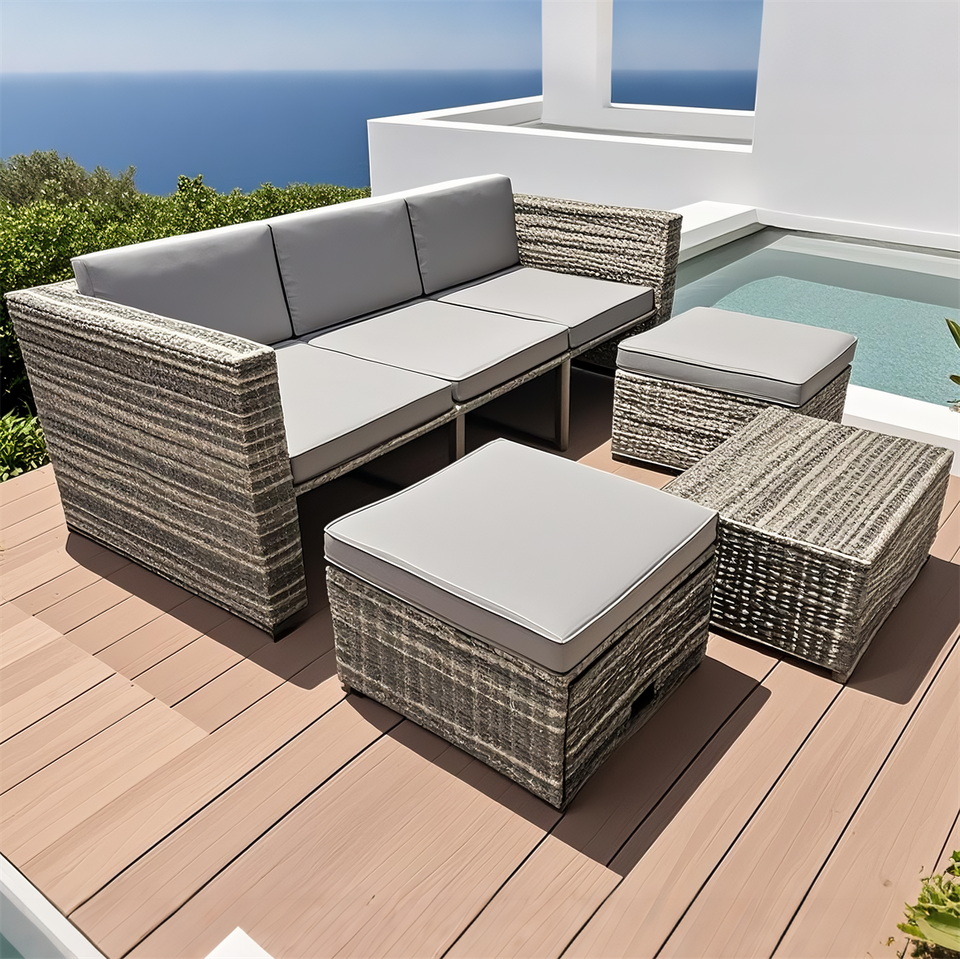 Juego de sofá de ratán modular gris Mel que ahorra espacio | Sofá otomano/Almacenamiento de mesa | Salón de 6 plazas con vistas al mar Villa Patio