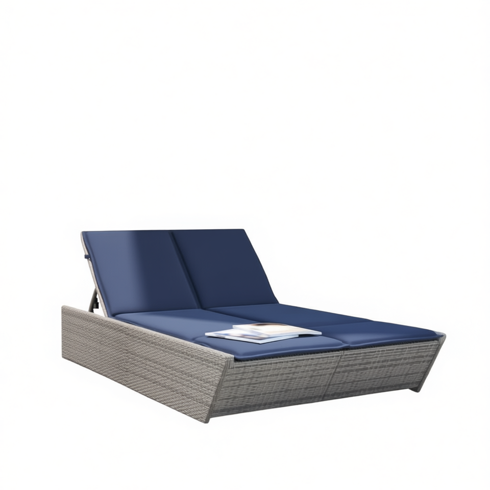 Tumbona Doble de Ratán PE Gris para Patio con Cojines Azules, Reclinación Manual, Muebles de Exterior de Diseño Moderno