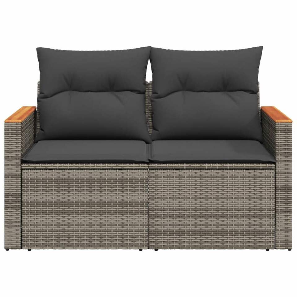 Sofá de Jardín de Ratán Gris con Brazos de Madera de Acacia, Muebles de Exterior de Dos Plazas, Cojines Impermeables, Diseño Elegante y Duradero