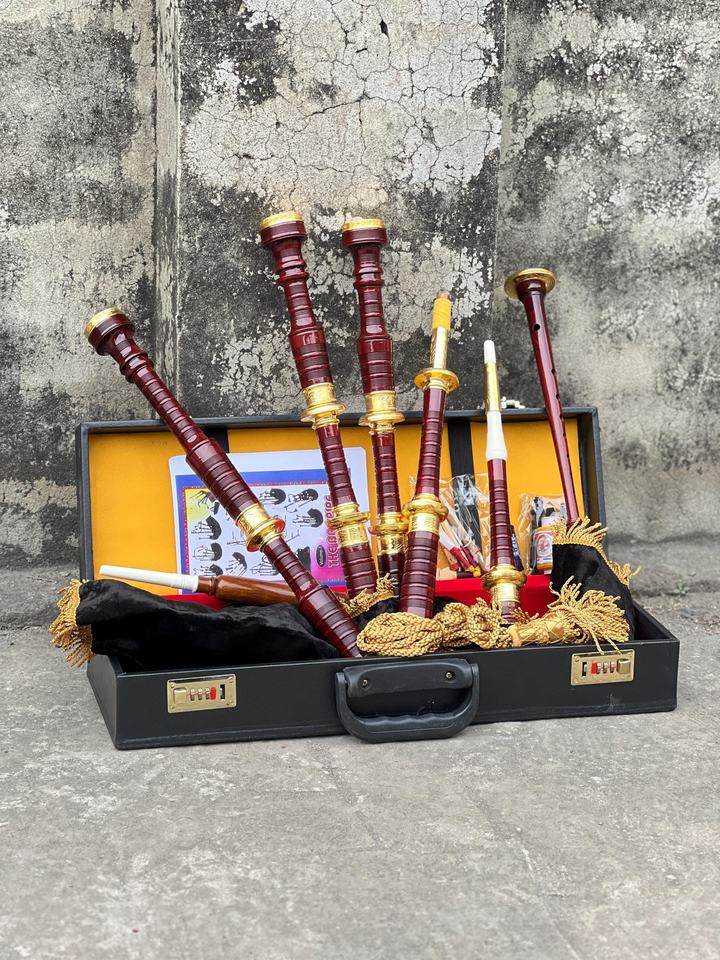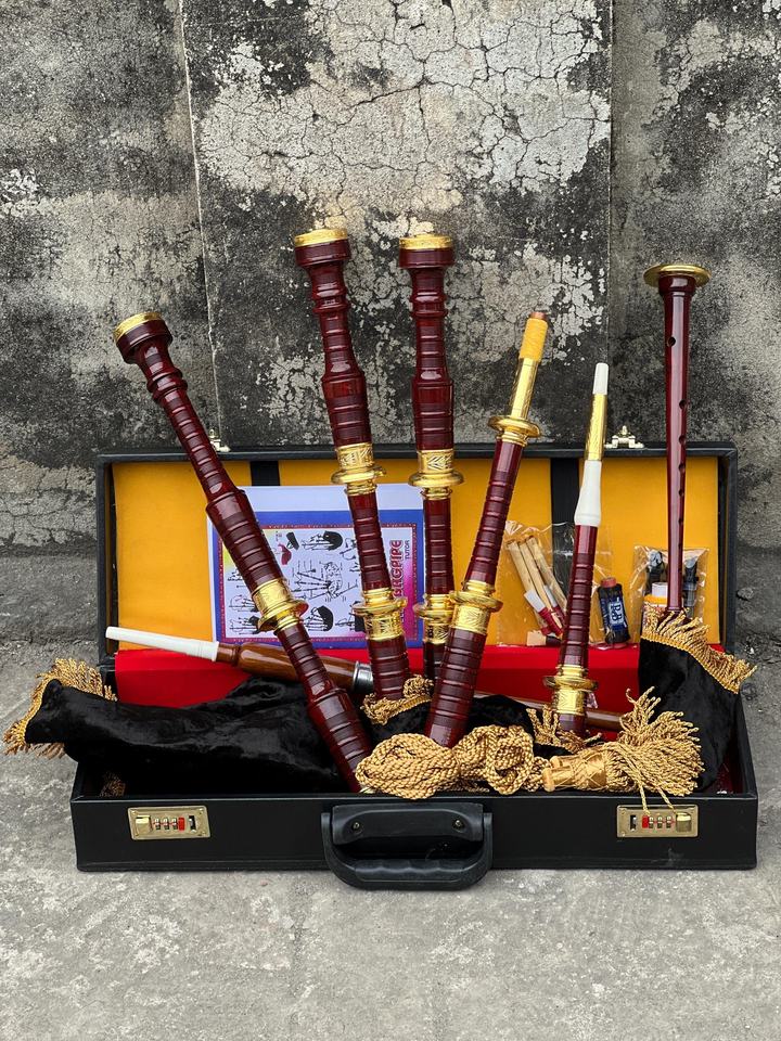 Gran Gaita Escocesa de las tierras altas monturas de latón grabadas en oro en terciopelo negro con estuche rígido