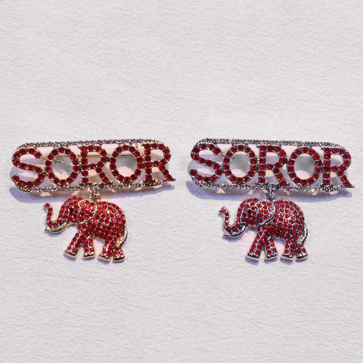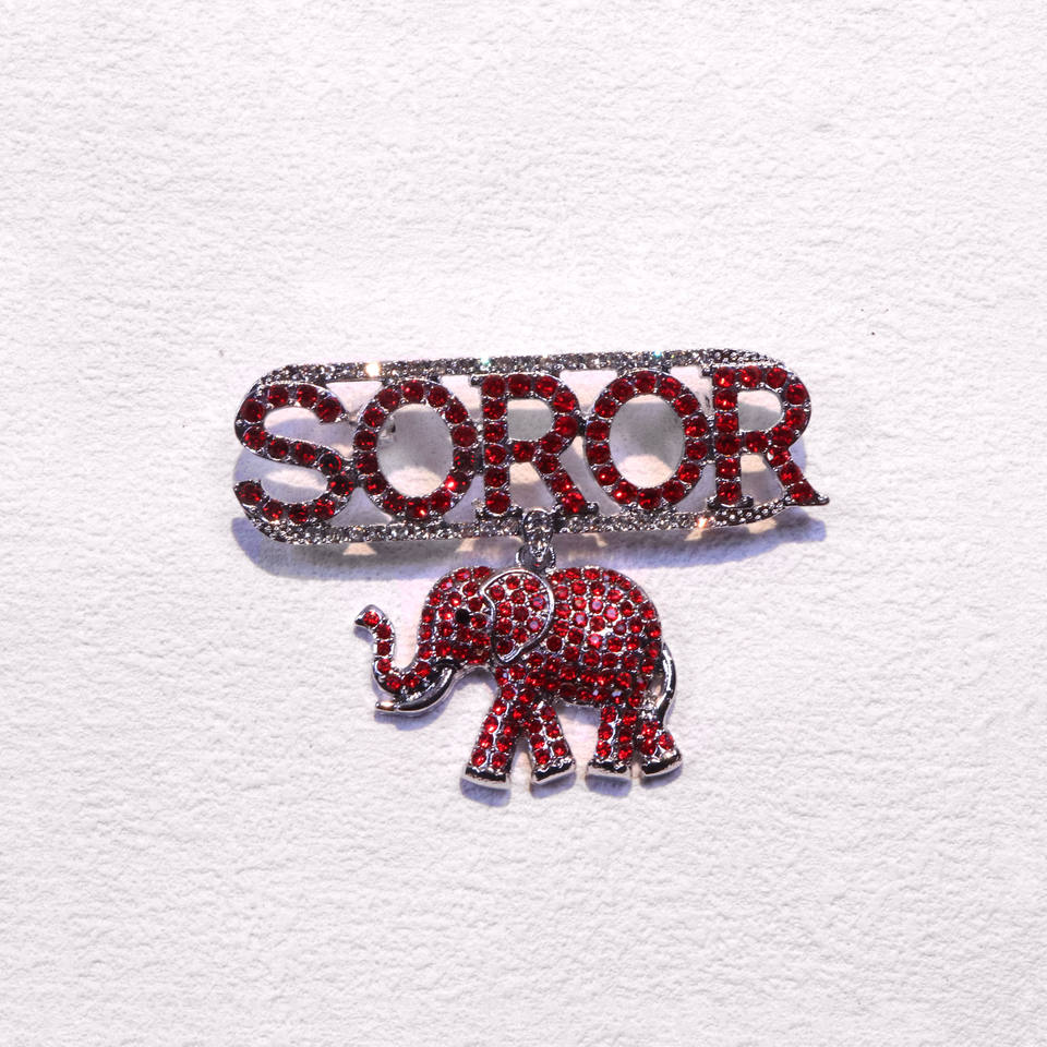 Diseño del símbolo griego Delta Sigma con pedrería roja. Broche Estilo Elefante SOROR.