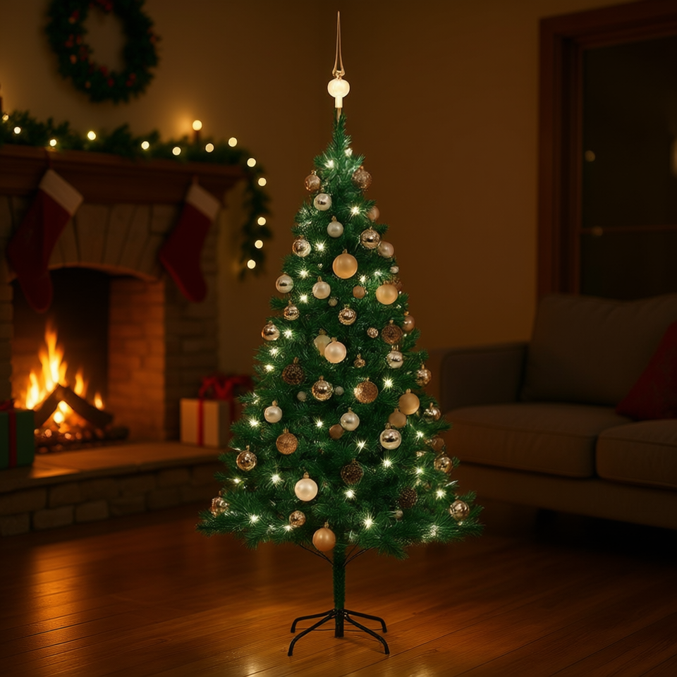 Árbol de Navidad Artificial de PVC Verde de 59.1 Pulgadas Preiluminado con Juego de Bolas, Luces LED Blancas Cálidas, Base para Interior