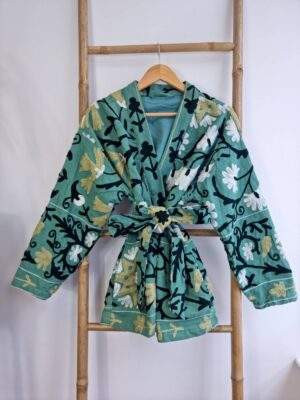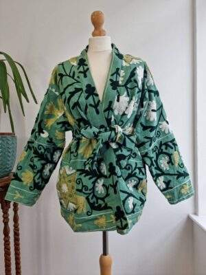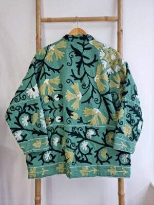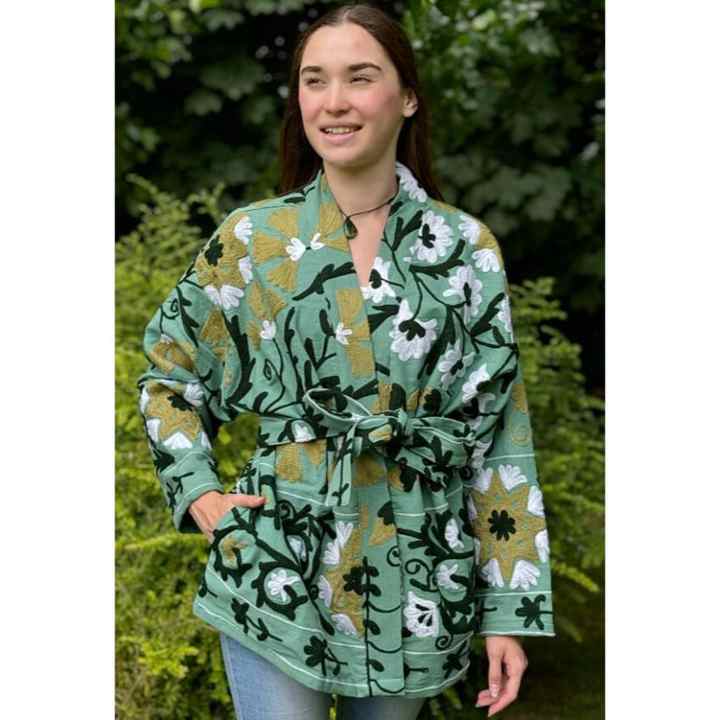 Chaqueta verde Bohemia bordada con cinturón para mujer hecha a mano Suzani Floral étnico abrigo Boutique Boho prendas de vestir exteriores proveedor