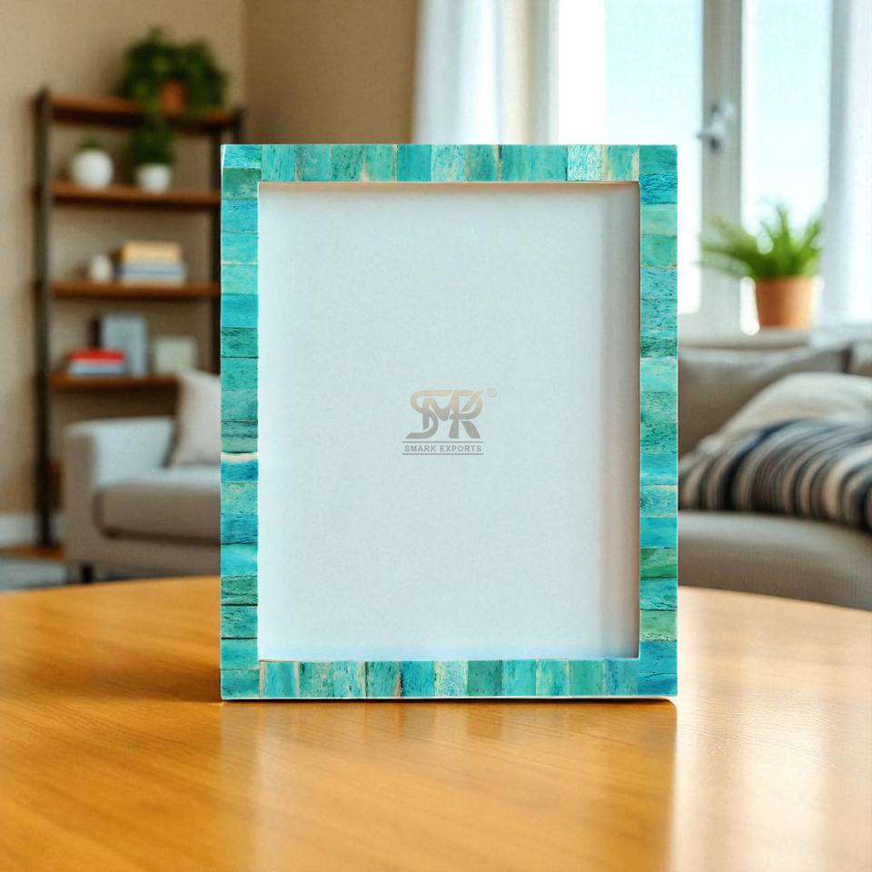 Marco de Fotos Hecho a Mano con Incrustaciones de Hueso Verde y Cristal Flexible, Tamaños Personalizables, Exhibición de Mesa y Pared