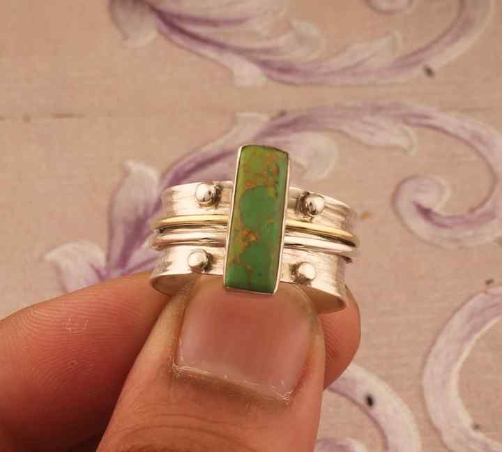Anillo giratorio de Plata de Ley 925 hecho a mano, barra turquesa de cobre verde, textura de piedra, banda de fiesta de boda de Plata de Ley 925 sólida