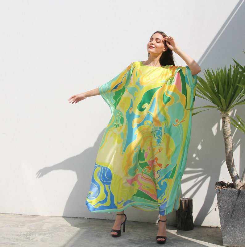 Kaftan verde elegante vestido de crucero amarillo estampado abstracto vestido de noche elegante cómodo Resort Wear Dubai vacaciones