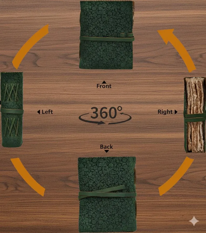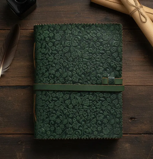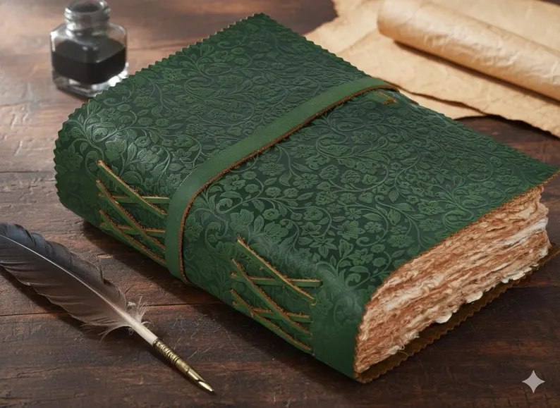Diario de Tapa Dura de Cuero con Grabado Floral Verde, Cuaderno Hecho a Mano con Borde Rústico, Papel Libre de Ácido, Diseño Rústico Vintage