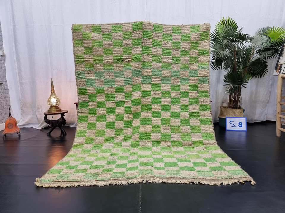 Alfombra verde marroquí hecha a mano Boujaad, diseño bereber a cuadros abstracto, pelusa de lana de invierno esponjosa para el espacio de la sala de estar del hogar