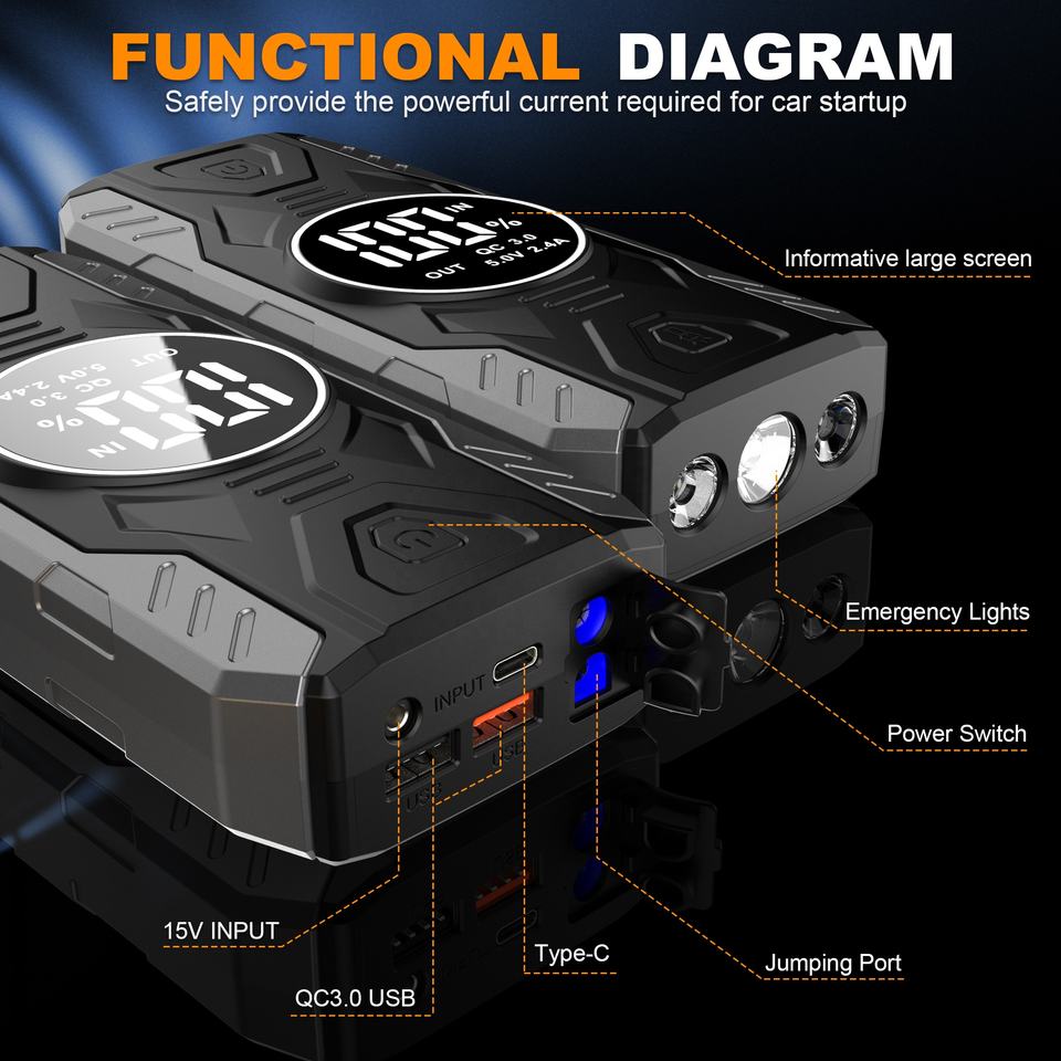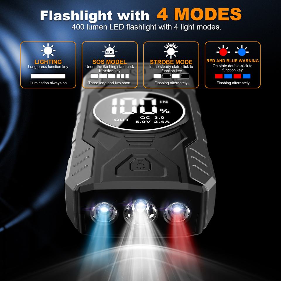 Coche de pasajeros, Motocicleta, Camión, Coche 12V, Móvil, Ordenador portátil, Camping, Lingting/STROBE/SOS, Brújula, 6L de gas y motores diesel 4L, Compresor de aire