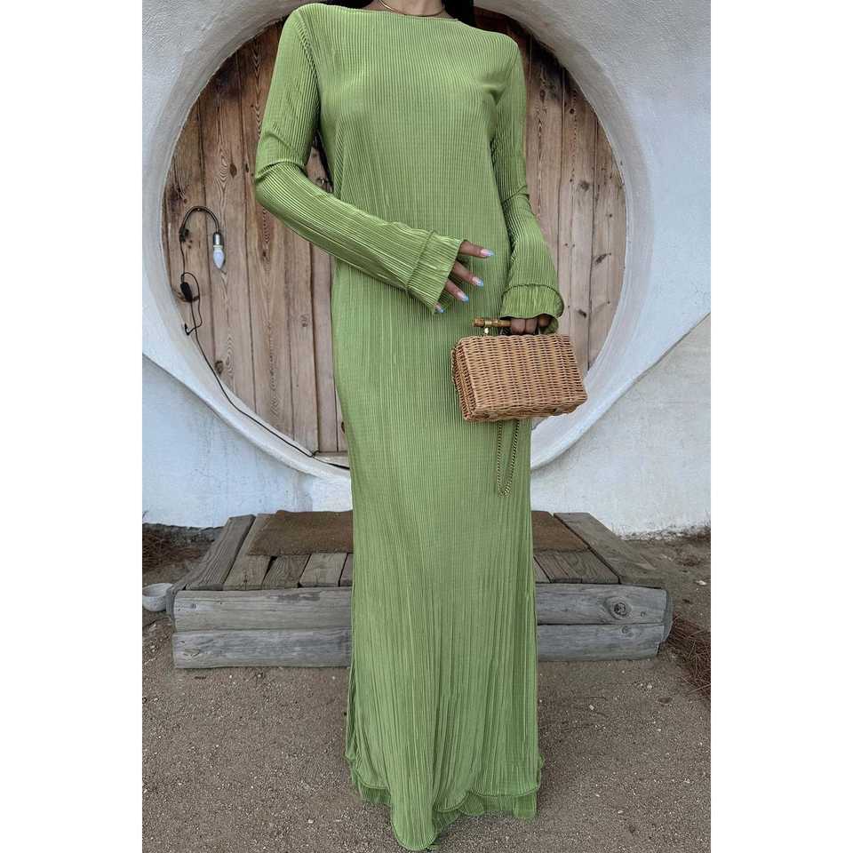 Vestido de Noche Verde Mirela Plisado de Satén y Poliéster con Cintura Imperio, Mangas Cortas, Largo hasta el Suelo, Talla XL, Ideal para Fiestas y Bailes de Gala