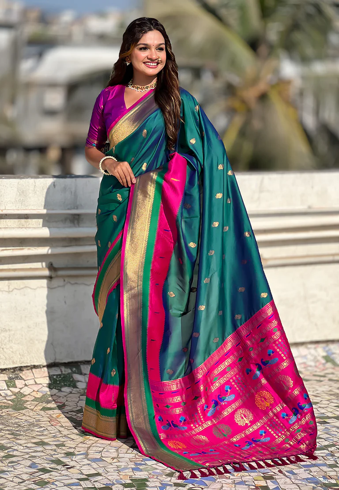 Sari de seda Paithani verde con motivos tradicionales de Muniya y elegante borde de satén para una celebración étnica rica y elegante